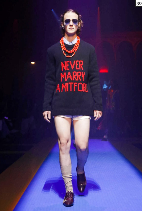 Сегодня в Милане прошел показ весенне-летней коллекции Gucci. Помимо колготок со стразами, платьев с гигантскими пайетками, винтажных сумок и шлемов, украшенных кристаллами, Алессандро Микеле выпустил свитер с надписью Never Marry a Mitford. Оказалось, что у этой вещи богатая история. О том, чем вдохновлялся дизайнер, фэшн-журналист Катя Федорова рассказала в своем Telegram-канале Good morning, Karl!