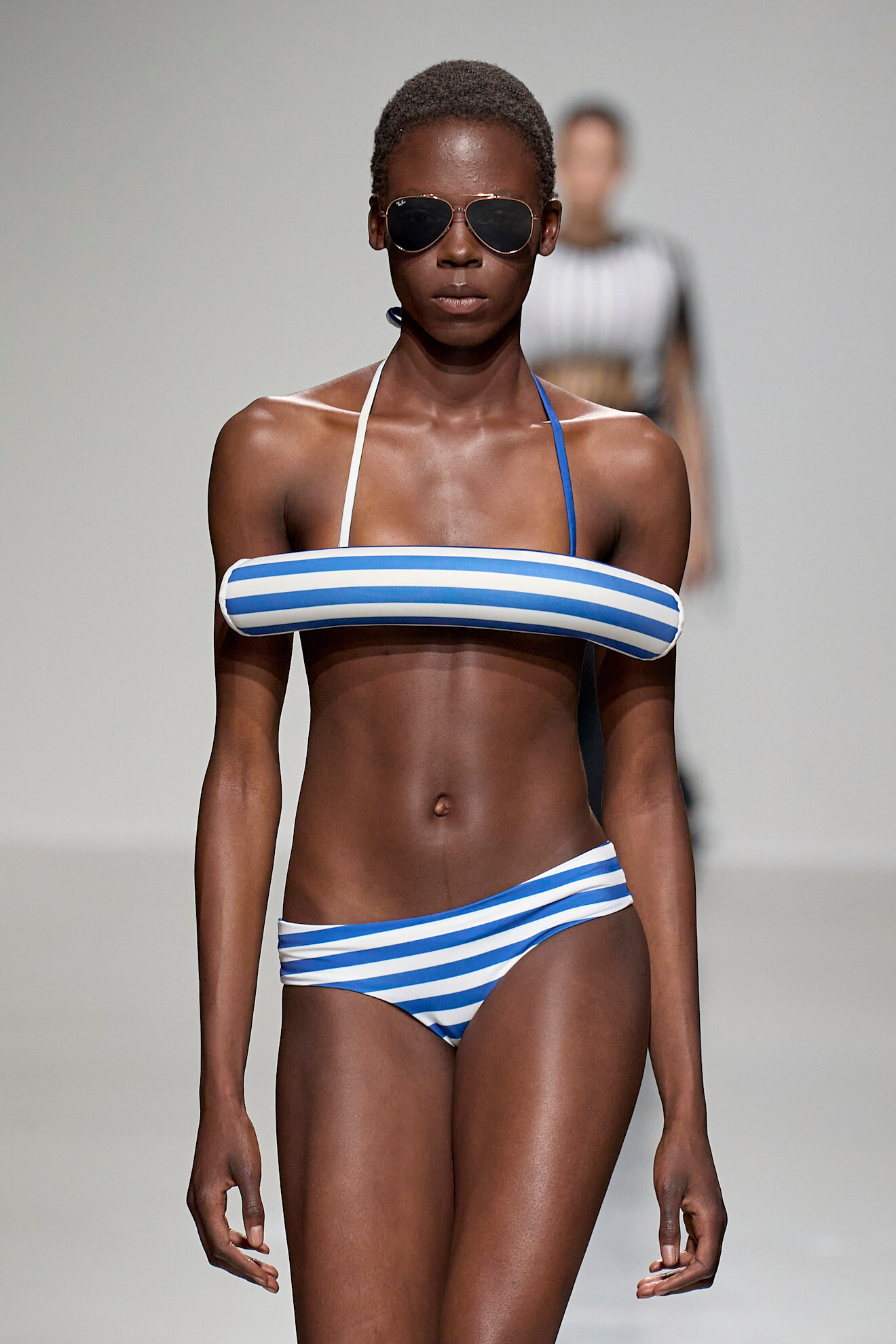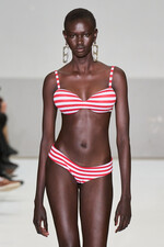 На деле же Лантинк просто сделал ставку на один из любимых приемов Готье tromp l’oeil — хотя в разговоре с Николь Фелпс гордо заявил, что пока не заходил в архив Jean Paul Gaultier. Объяснив это прежде всего тем, что для начала «хочет представить, что за его дверью». Возможно, слукавил, а может, действительно руководствовался лишь тем, что когда-либо услышал о Готье, — видимо, по сломанному телефону (не зря же полчаса до начала шоу мы смотрели трансляцию с якобы нечаянно включенной мобильной камеры). Иначе как еще объяснить, например, карикатурные боа с bullet bra — не конусообразными и острыми, а шарообразными? Или тельняшки, превращенные в странноватые боди и легинсы?