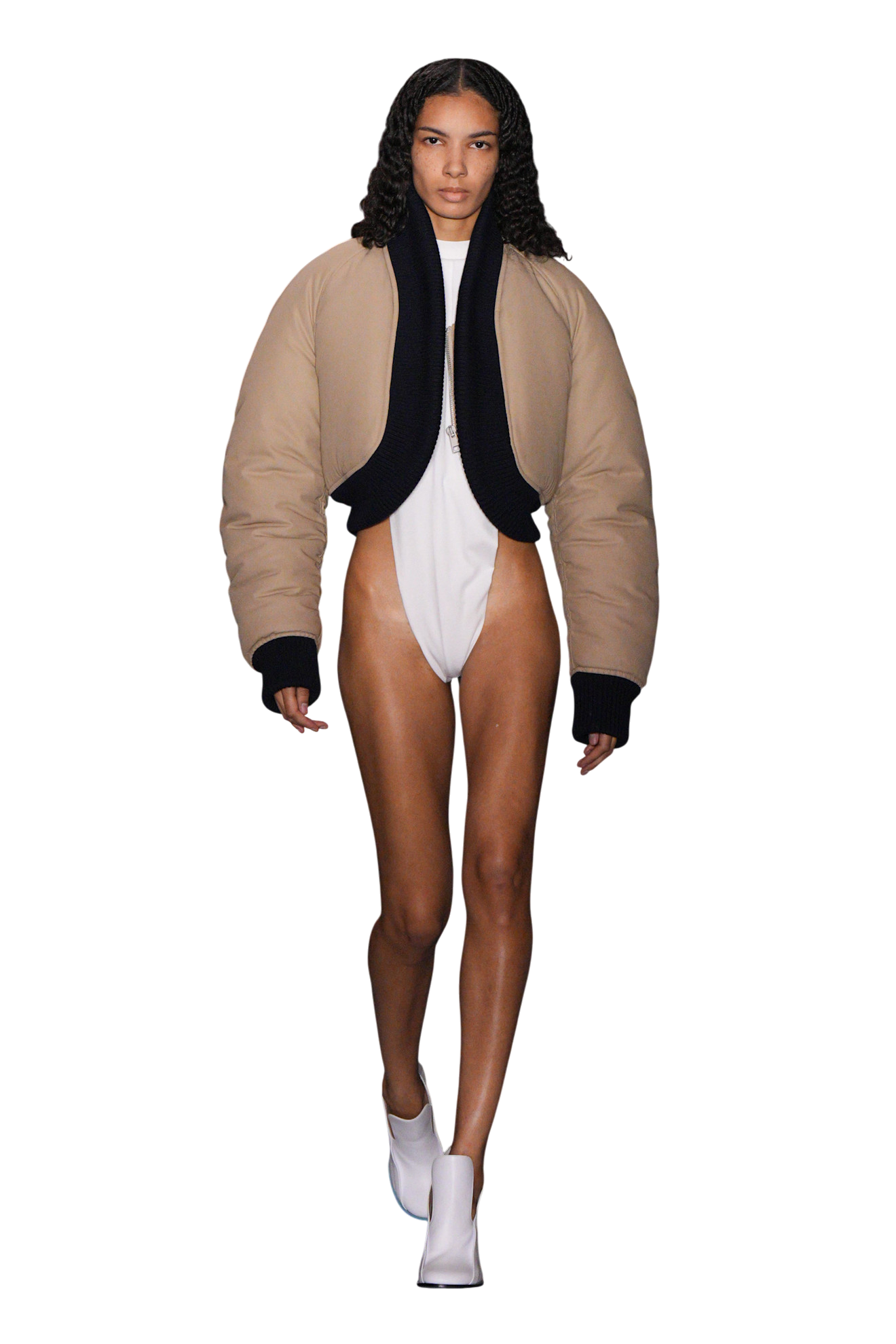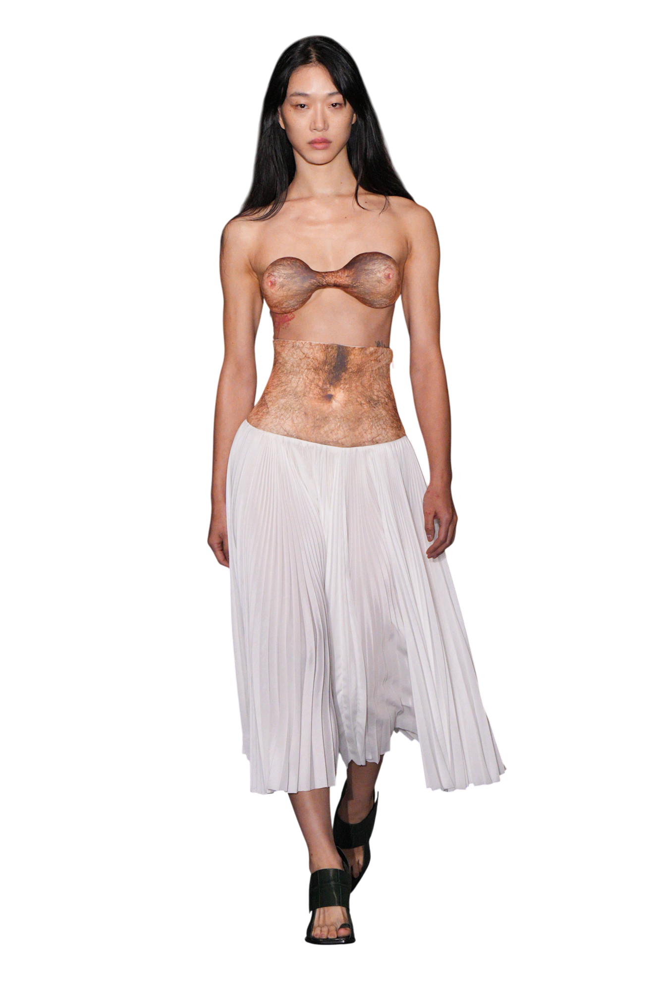 Но есть ощущение, что для создания волосатых боди и тому подобных обманок (многим их ироничность показалось слишком уж плоской) Лантинку Jean Paul Gaultier не нужен. Они бы вызвали куда меньше вопросов, останься в именном бренде дизайнера — тоже довольно провокативном. Вспомнить топы, имитирующие голые торс и грудь, недавно показанные им в коллекции Duran Lantink осень—зима 2025/2026. Или брюки, силуэтом напоминающие вульву, что дизайнер сшил для Жанель Монэ и ее клипа Punk. Хотя главное, что Дюран «перетащил» на новое место работы, так это заигрывание с объемами: показанные вчера будто надутые трусы и бра можно обнаружить примерно в каждом сезоне Duran Lantink. Ровно как и «левитирующие» над плечами бретели топов и платьев. А еще брюки и бриджи, сделанные из разноцветных кусочков кожи, денима и нейлона. Но справедливости ради, несколько добротных вещей в коллекции все же нашлось: глянуть на скульптурное черное платье из сетки и белое пальто, прострочкой и вздернутыми полами отсылающее к любимой Жан-Полем шляпе морячка. На укороченный бежевый жакет, что в сочетании с юбкой в тон напоминает разрезанный на две части классический тренч. Или на черную юбку в белый горошек — с глубокими вырезами на бедрах. Даром что приятное впечатление от них перебили цветастые брюки, мутировавшие в строительные пояса — в духе Off-White уже без Верджила Абло.