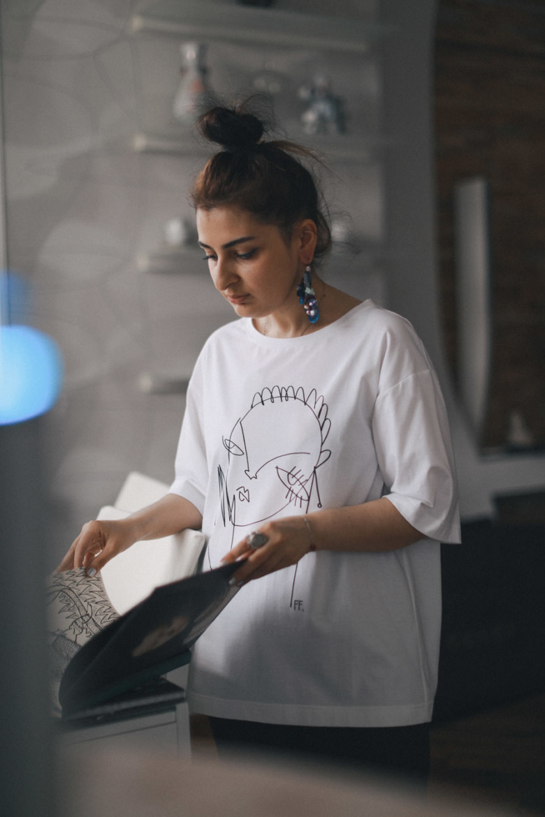 В России у меня спрос на более простые вещи: здесь заметили черно-белую рубашку, а в Париже на нее совершенно не обратили внимания. Для них это просто рубашка, они отметили пальто, пижаму, юбку, которая выглядит как витраж. Оказалось, что по стилистике для европейских байеров это Япония и Китай: все такое мультяшное, анимешное. Но всем, кстати, нравятся футболки. Я думала раньше, что у дизайнеров, которые делают футболки, нет таланта, что ли. Потом поняла, что это так круто. Футболка — это белое пространство, и ты должен его грамотно заполнить. Принт — это же миллиметры, сделать повыше, подвинуть налево или направо — будет уже не то.
