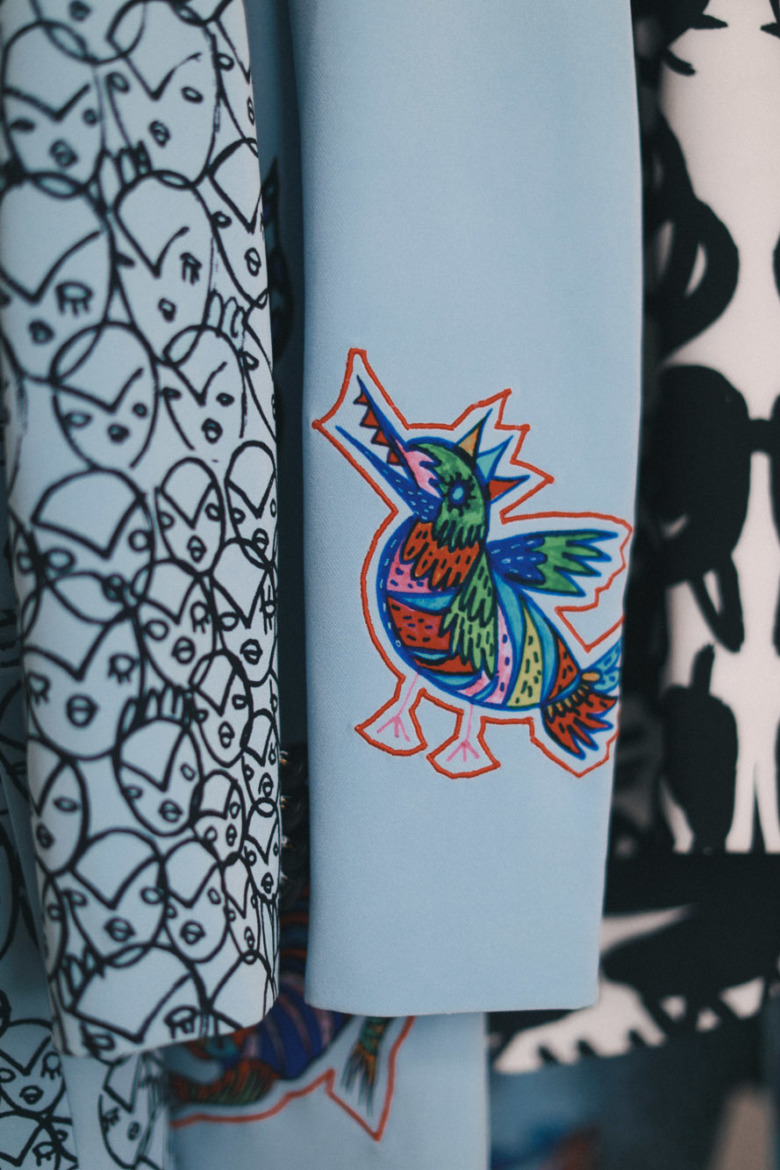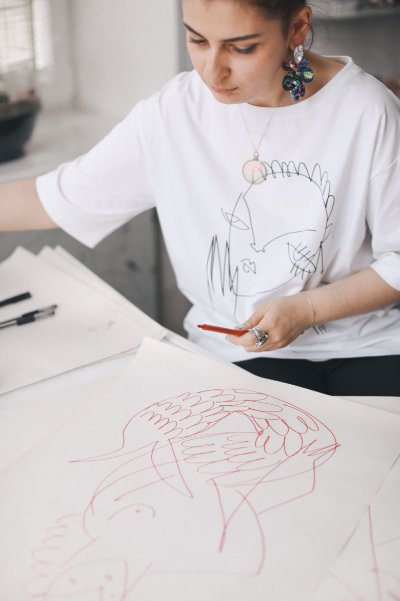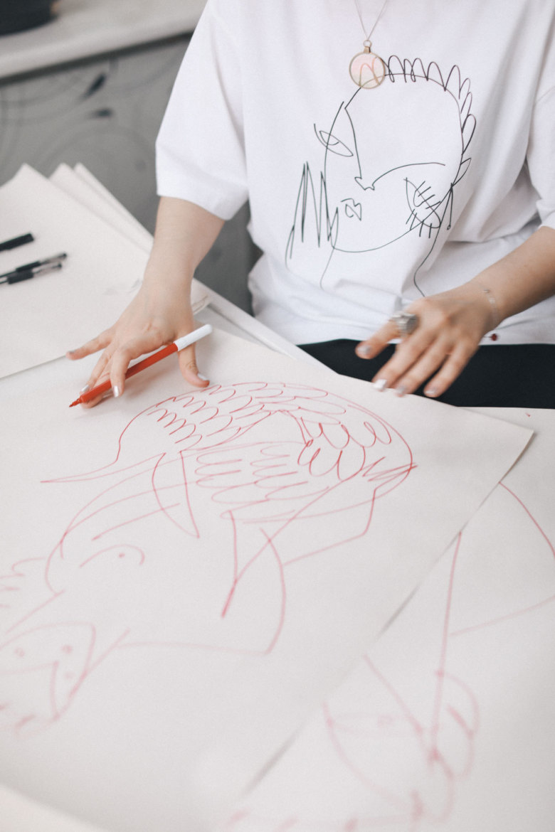 Первый звоночек, что принты — это что-то потрясающее, прилетел от Натальи Алавердян. Это было в самом начале, когда я только приехала в Москву. Она искала ассистента, и я отправила ей свое портфолио. Мы встретились, я рассказала, что я художник и дизайнер, и она попросила меня нарисовать стрекоз. Буквально через пару дней — я очень быстро рисую — я задумалась: зачем ей мои рисунки? Я вообще умею рисовать? Я не понимала, что этим умением можно пользоваться и продвигать его. Из эскизов Наташа выбрала самый странный, на мой взгляд, — а потом представила коллекцию A.W.A.K.E. c этим принтом в Париже. Моя первая коллекция для FactiveFace была очень шальная: и стразики, и цветочки, и драпировки, и принты. В Милане на Pitti Super ко мне подошла Мария Тер-Маркарян и сказала, что я больше художник, а не дизайнер, посоветовала упрощать дизайн и делать акцент на принты. Все эти люди меня направляли и выбирали не одежду, а именно рисунки.