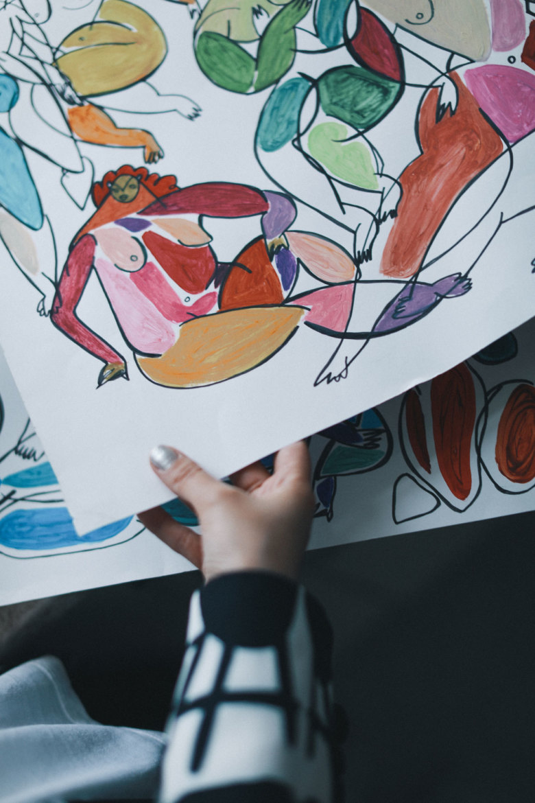 Поэтому я решила сосредоточиться полностью на рисунках и принтах, упростила дизайн в этой коллекции — и в следующей, наверное, тоже будет так. Не потому, что у меня не хватает фантазии, а так надо, рисунок стоит на первом месте.