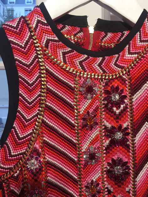 Тема моей весенне-летней коллекции — ностальгия по детству, по беззаботным временам, когда ты счастлив каждую секунду. Мы использовали много элементов игры: раскраски с цифрами, лего, конструкторы и плетеные браслеты. Чтобы воплотить задумку в жизнь, не обязательно придумывать принт, можно создать новую технику вышивки. Например, вместо рисунка на юбке мы расшили ее деталями лего. Как сделать платье — браслет дружбы? В нашей студии в Лондоне мы увеличили на компьютере пятисантиметровый плетеный браслет до пятидесяти сантиметров и придумали, как его вручную сшить, чтобы он был максимально похож на прототип, но при этом идеально сидел на женской фигуре. А потом в течение трех месяцев мы тесно работали с индийскими мастерами, чтобы показать им, как правильно его исполнить. Им пришлось искать подмастерьев со всей страны, потому что не каждый может сплести такое платье вручную. В итоге все три платья были готовы буквально за два дня до показа! На изготовление одного ушел целый месяц.