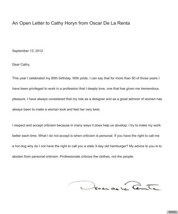 чтобы ответить кэти хорин, оскар де ла рента купил целую полосу в главном модном вестнике WWD