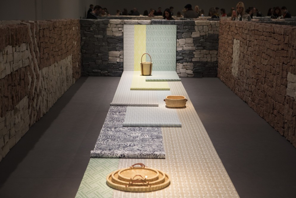 Loewe всегда работают с крафтом и с ручными изделиями, и они представили плетеные вазы, корзины и сумки, которые специально для них сделали разные художники. Опять-таки все это в окружении деревьев и цветов, что тоже возвращает нас к мыслям о ручном труде. Около этих корзин развешаны белые ткани с принтом Loewe; выглядит так, будто ты действительно находишься в деревне, где прямо при тебе плетут эти корзины.
