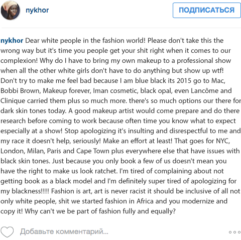 «Дорогие белые люди в мире моды!», — так начинается горячее обращение суданки Никор к представителям индустрии, в котором она в очередной раз поднимает вопрос востребованности модели в зависимости от ее оттенка кожи. Жестокий отбор, в котором темнокожим моделям нет места, по ее словам, работает на всех главных мировых модных неделях. И «небелым» девушкам надоело с этим мириться.