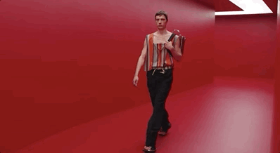 При этом разговор о новой маскулинности совсем не в лоб. Дизайнеры не переодевают мужчин с ходу в юбки или платья, а лишь немного стачивают углы с помощью деликатных деталей. С помощью квадратного выреза, который вдруг показывает ключицы; с помощью чуть опущенной линии спины у маек, чтобы было видно лопатки; с помощью брюк с заниженной талией. Трикотаж, из которого и топы, и дополняющие менее мягкие образы манишки; худи из махровой ткани (которой заметно много в текущей женской коллекции Prada) — что, как не это, метафора нежности, которой в мужском гардеробе до сих пор не стало достаточно много? В этом переходе от нарочито мужского к свободному Миучча и Раф как никогда деликатны: лучший пример такого бесшовного перехода — экстремально короткие юбки-шорты, которые дизайнеры предлагают весной и летом 2022-го носить мужчинам (Миучча, кстати, обычно предлагает носить такие девушкам в Miu Miu).