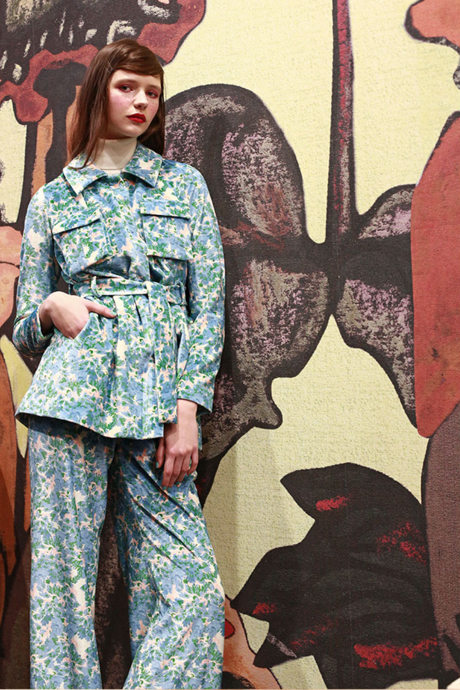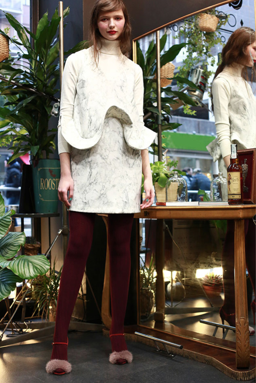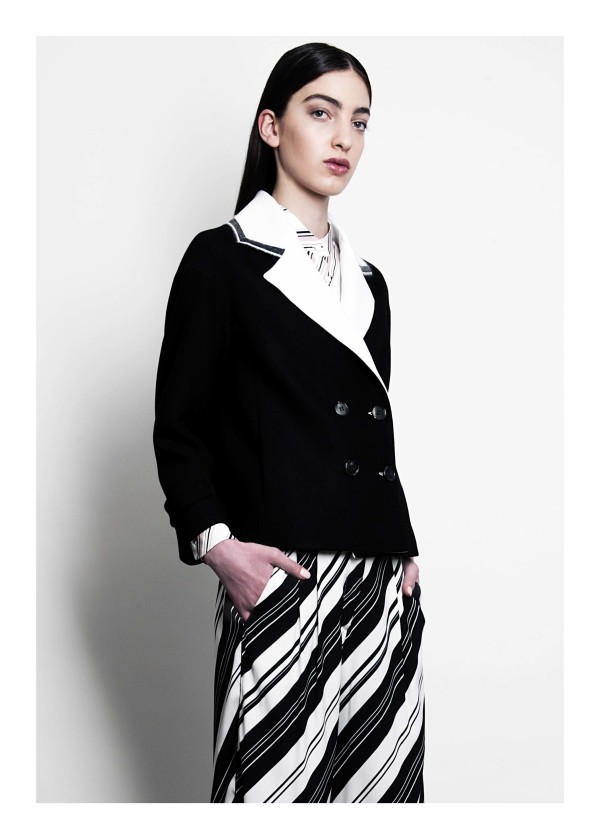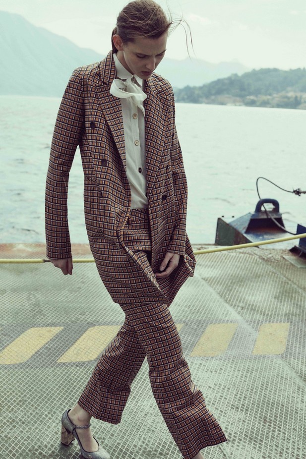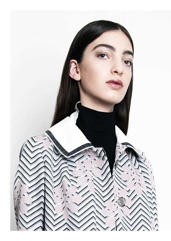«Это все про мой дом — Амальфи. Здесь два основных принта: цветочный паттерн “любит-не любит” и средиземноморский — с силуэтами домов. Эти принты я создаю сама, таких больше ни у кого нет. Коллекция очень маленькая: обычно я начинаю с черно-белого и потом разбиваю линию яркими цветами или контрастными деталями». Марианна Чимини, дизайнер коллекции, — один из молодых дизайнеров с юга Италии, специально приглашенных участвовать в выставке White при поддержке государства. Марианна переехала в Милан, где училась в Институто Марангони, затем три года работала в Max Mara и Tod’s, а в 2012 году запустила собственный бренд. «Моя карьера довольно типична для Италии: сначала ты работаешь на большой бренд, понимаешь, как все устроено, потом уже запускаешь свое». Судя по благородным, свободным силуэтам брюк, рубашек и жакетов из шелка и хлопка, Марианна не зря провела время в больших домах: несмотря на юность марки, вещи выглядят спокойными, качественными и взрослыми.
