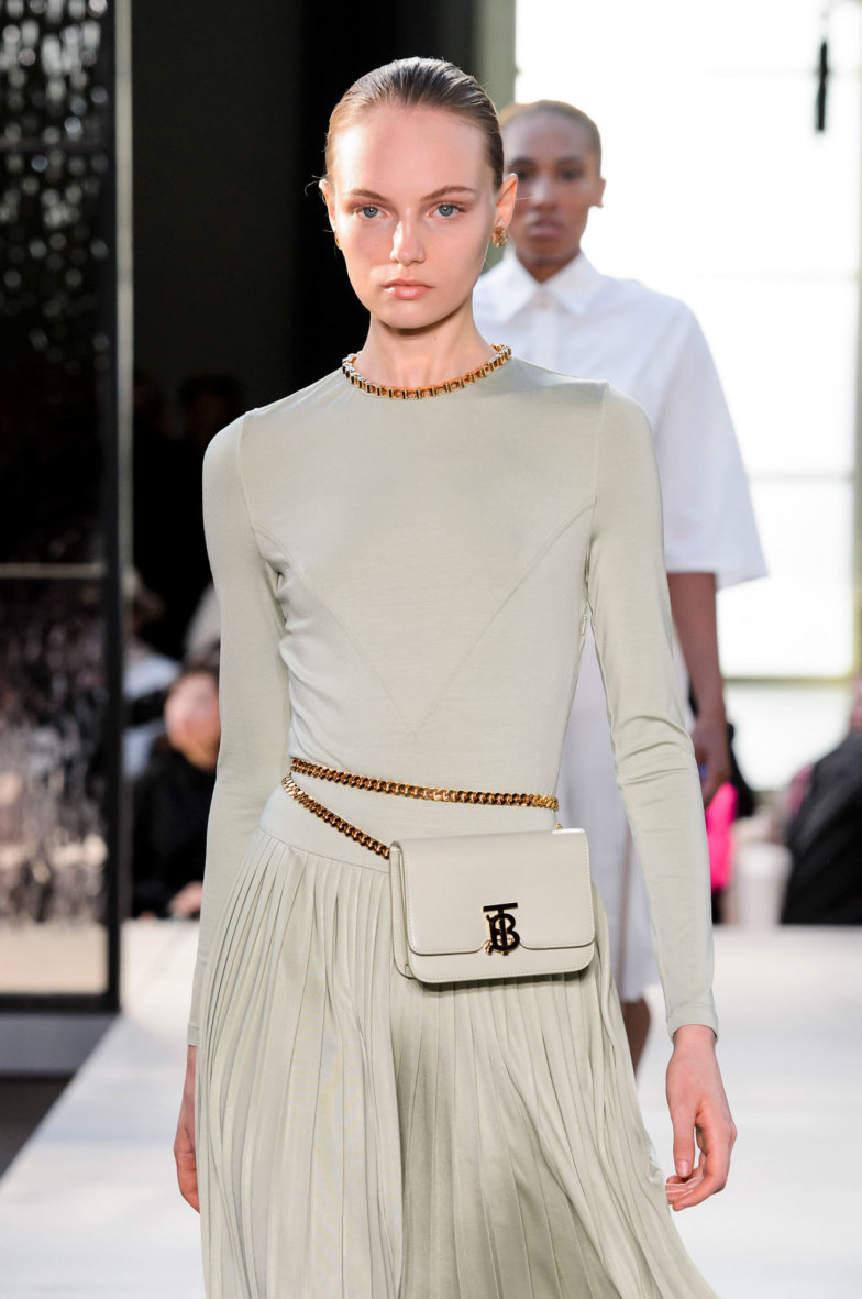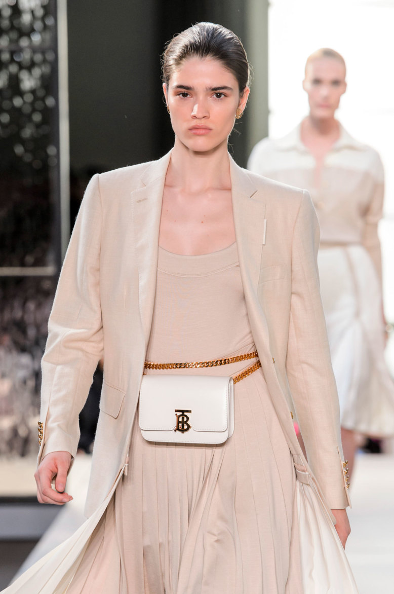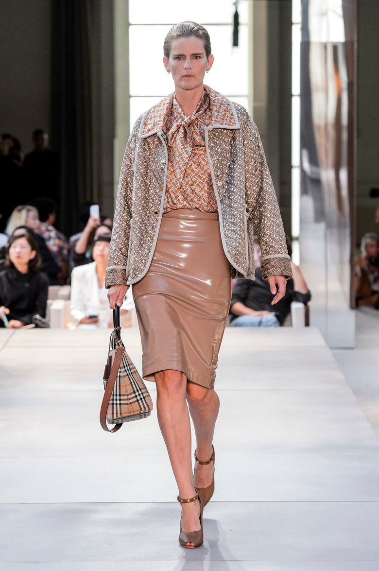 Сам Тиши разделил коллекцию на три части. Первая, Refined, как раз отсылает к истокам. Здесь и шелковые блузы с бантами (некоторые украшены новой монограммой, которую по заказу Тиши создал легендарный Питер Сэвил), и классические юбки длиной до щиколотки, и тот самый тренч, то подпоясанный широким кожаным ремнем, а то вовсе перешитый в платье на широких бретелях. Главный цвет тут, конечно, бежевый — один из главных цветов классического Burberry.