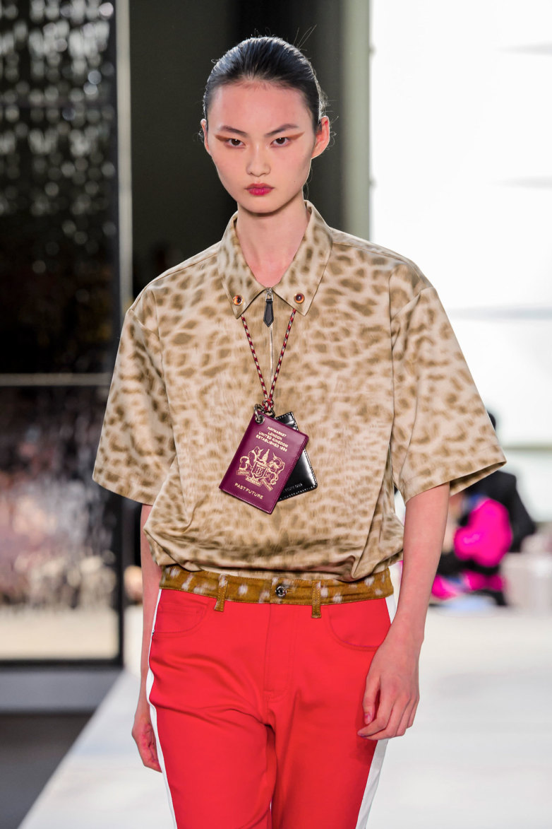 Главная деталь коллекции, конечно, поясная сумка. Причем эти сумки, как и одежду, можно разделить на Refined и Relaxed. Первые, кожаные и строгой формы, Тиши предлагает сочетать с блузами и юбками, вторые — по-спортивному объемные — с парками и худи. Есть в коллекции и большие сумки-шоперы, некоторые — с крупной надписью Burberry London England, на случай, если кто-то еще сомневается в том, что логомания больше не порицается. Есть и зонты-трости, которые модели носят за спиной; и даже бейджи в виде паспортов: на обложке цвета бургунди нарисован новый логотип и изображены горилла и единорог. Выглядит забавно, учитывая грядущий Brexit.