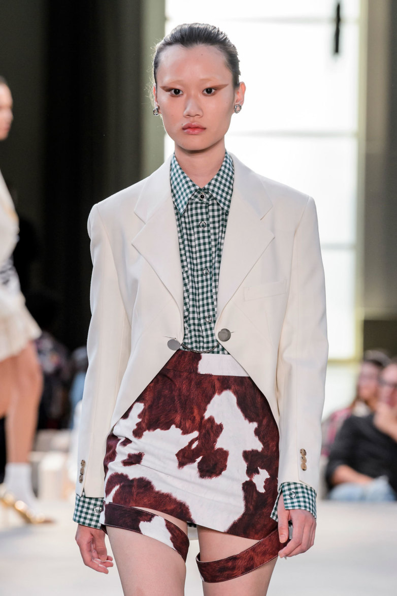 Здесь они остроумные и необычные, а изучать их можно часами: молнии в виде нового лого; брюки, пояса которых похожи на шелковые платки, золотистая бахрома на черных платьях; оборки, которыми украшены кожаные юбки; ремни, застегнутые на вороте; пояса, обернутые вокруг классических пиджаков.