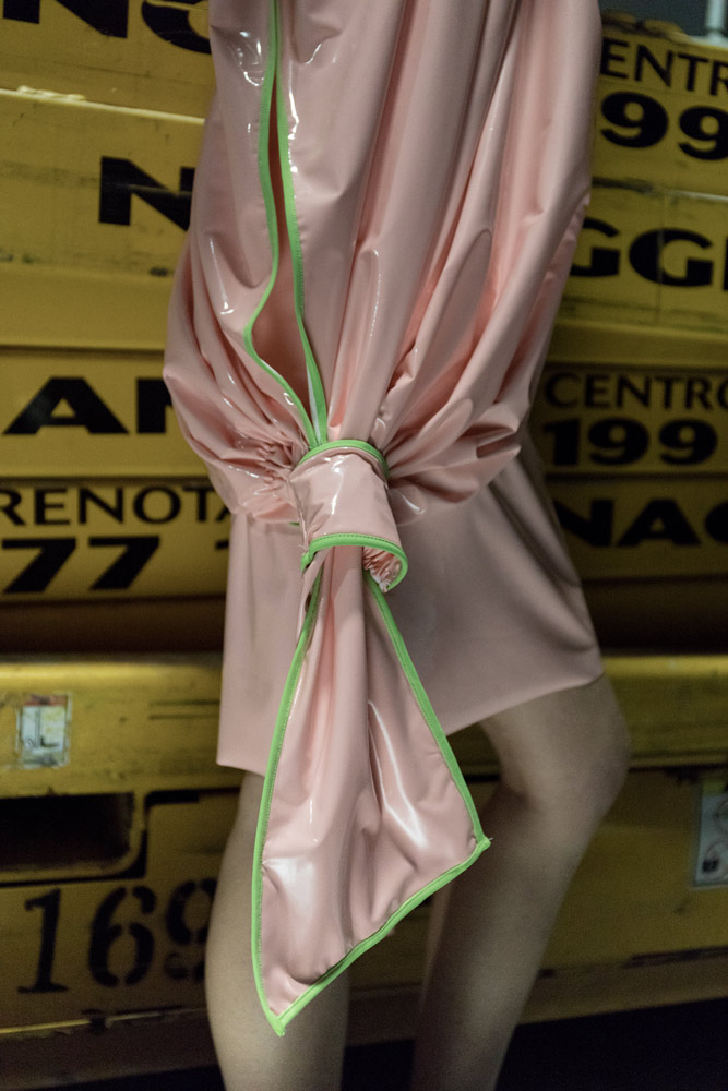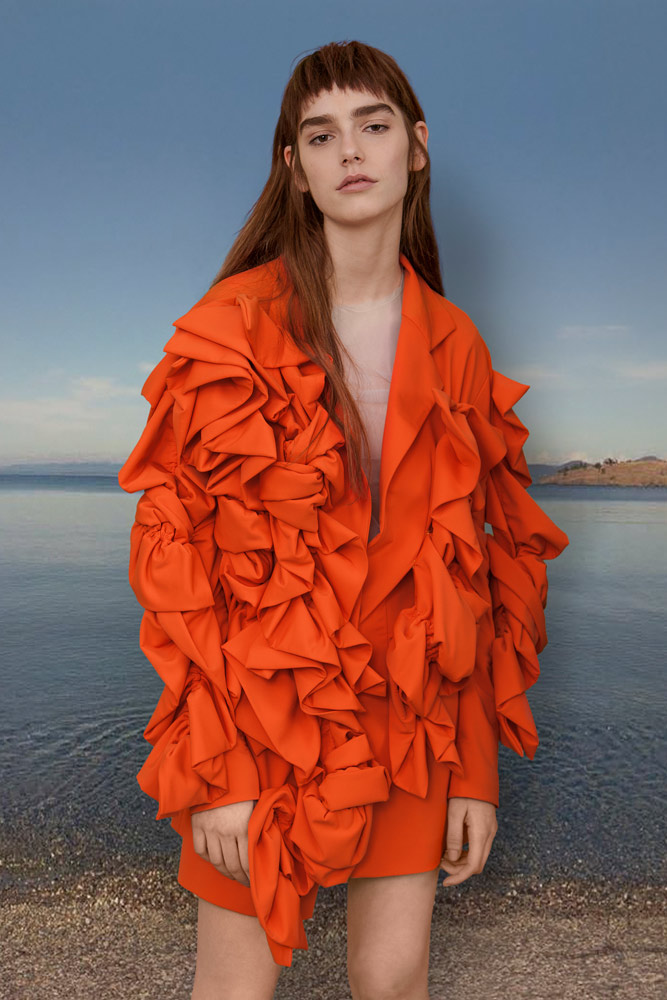 Еще одни избранники Vogue Italia. Экологичный бренд из Аргентины (только веганские ткани) много экспериментирует с формами и объемами, расшивая платья, пальто и жакеты выпуклыми цветами и оборками, собранными из ткани. Жаль, что эти эксперименты, прекрасно выглядящие на фото, в основном сшиты из неопрена и винила и оттого мало носибельны и тяжелы: тут разве что можно рассматривать коктейльный жакет, эффектная вещь на выход. Куда лучше бренду удаются простые формы — например, объемные платья-рубашки из тенсела красивых пастельных оттенков, некоторые — с рукавами, которые можно укорачивать, потянув за шнурок. Их и советуем искать, когда бренд начнет продавать весенне-летнюю коллекцию.