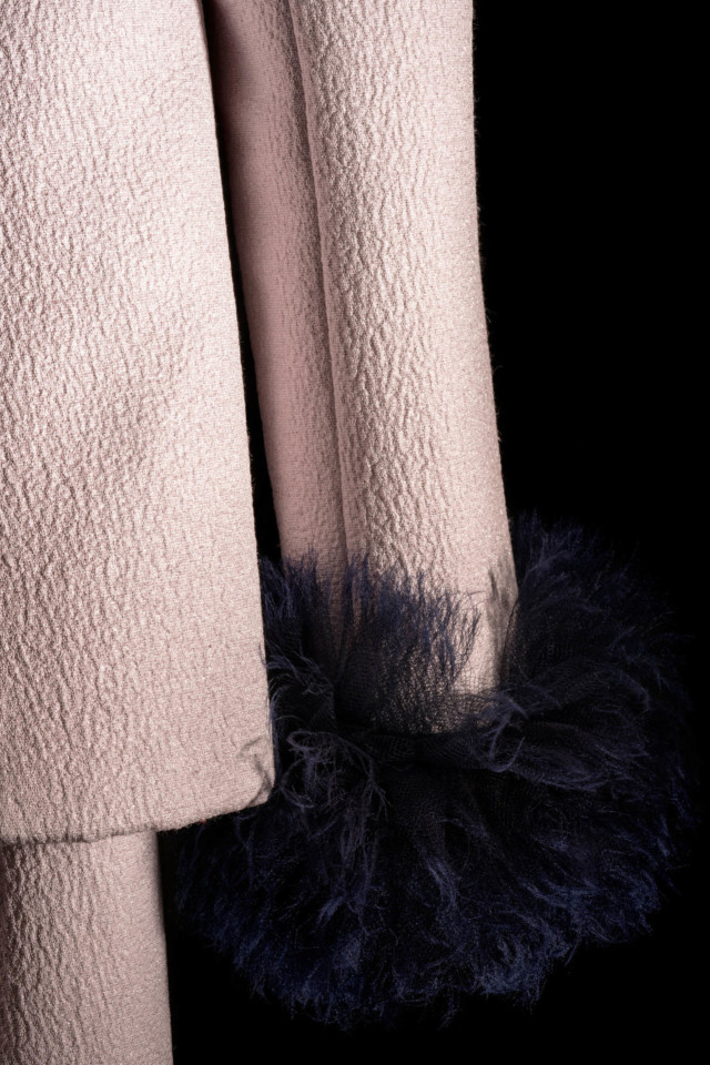 Нежная вышивка ателье Lemarié имитирует инкрустацию и выполнена при помощи перьев гуся, петуха и фазана, окрашенных в пастельные тона.