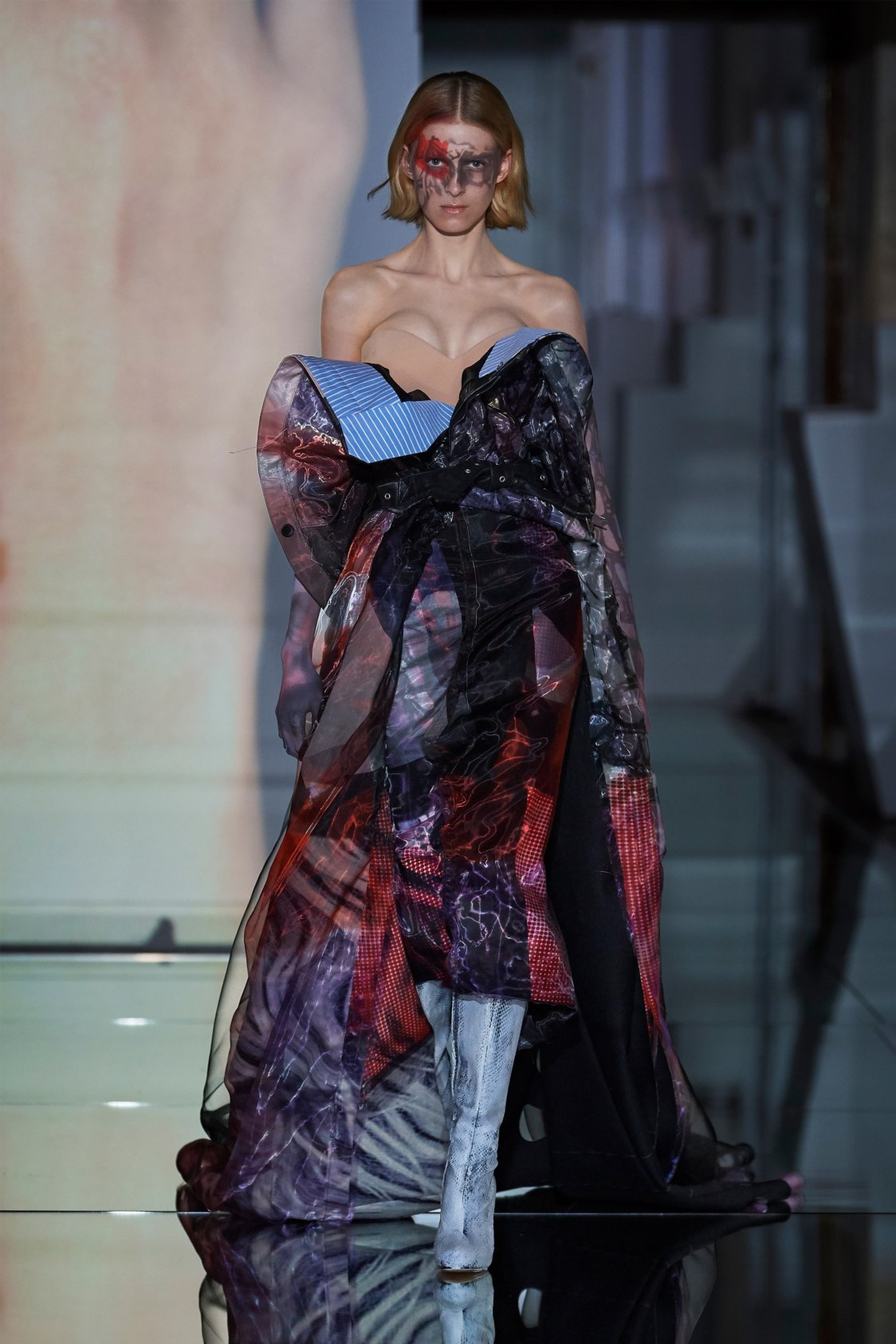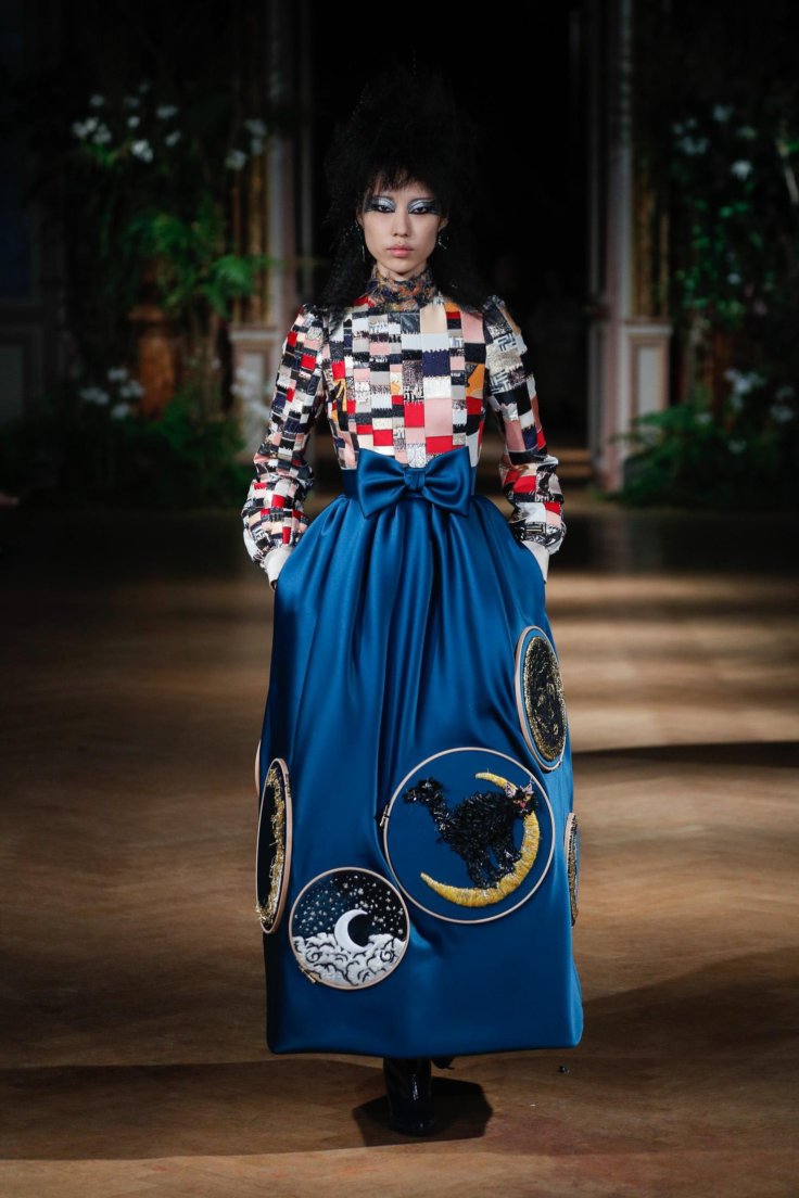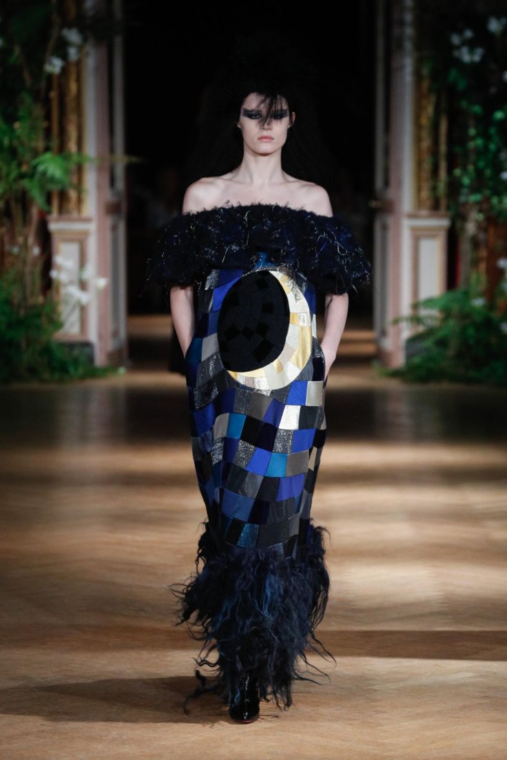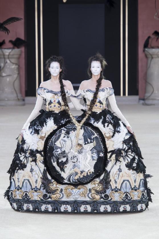 Художница по костюмам Гуо Пей превратила кутюрное шоу своего бренда в театр моды. Гротескные платья с объемными вышивками дополнял макияж, имитирующий грим актеров японского театра кабуки. Первый выход и вовсе превратился в перформанс: на подиуме появились две модели, «сросшиеся» в одно платье, словно сиамские близнецы. Перед платья был расшит образами птиц, животных, насекомых, астрологическими символами и сюжетами из театральных сцен, задняя сторона — черными перьями, а на стыке двух юбок вышили красное сердце с одним глазом. Волосы моделей также сплели в общую косу, которую «продолжала» вышивка, окаймлявшая круг знаков зодиака. Сама Гуо Пей назвала это платье «альтернативной вселенной», где особую роль играют вороны. «Они — посланники мудрости на границе между жизнью и смертью», — объяснила дизайнер.