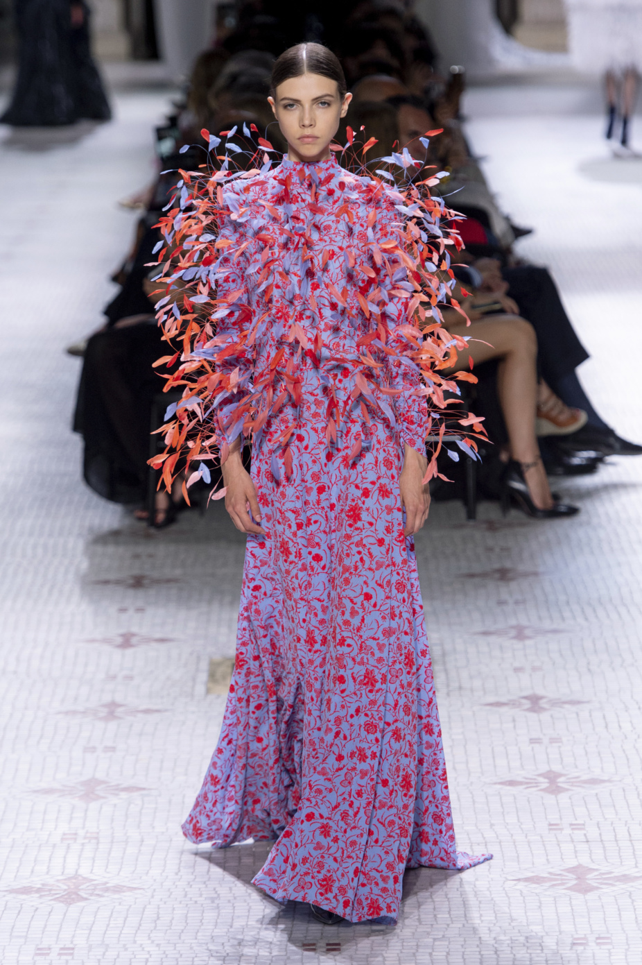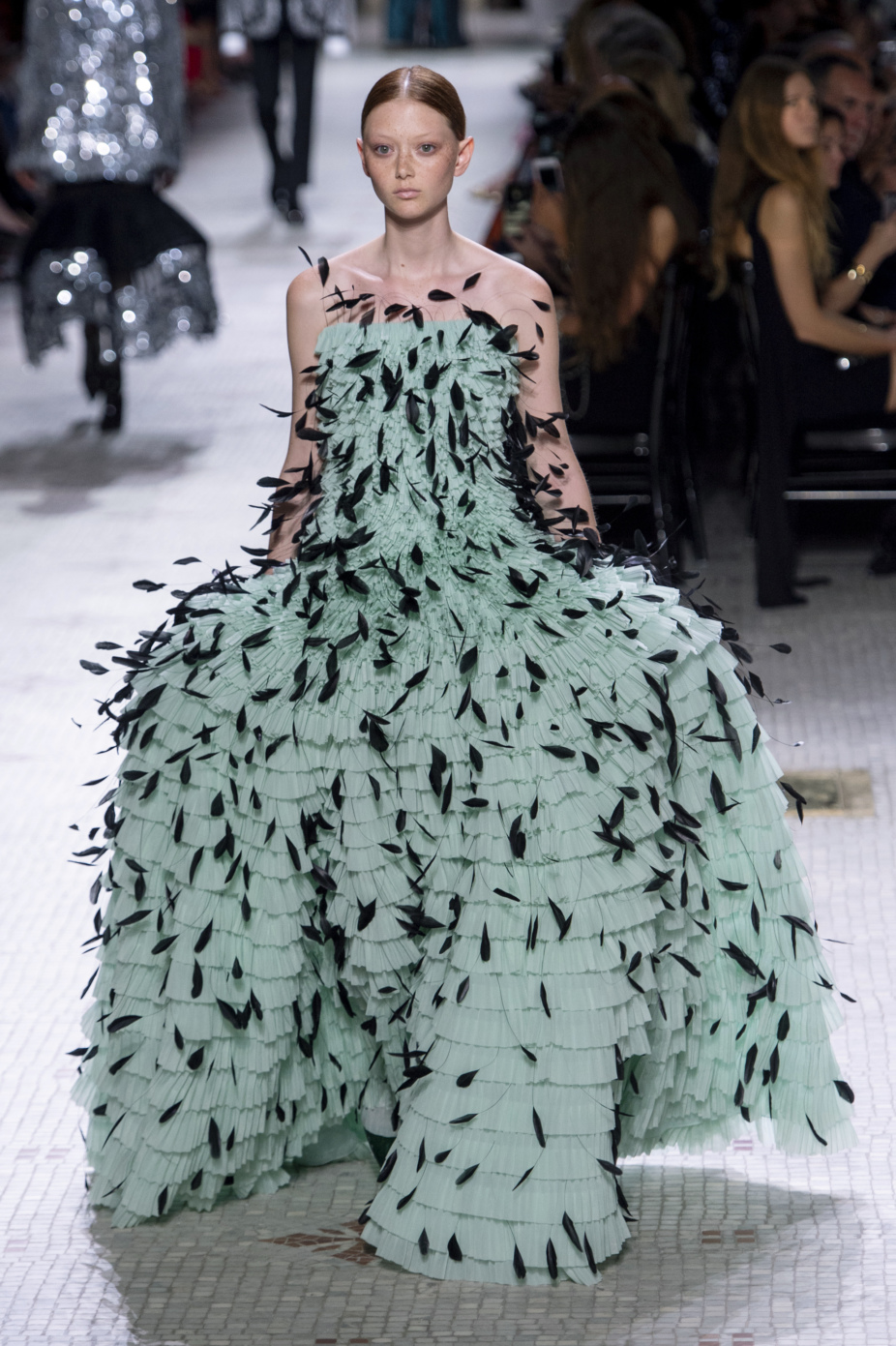 Givenchy провели шоу в Музее декоративно-прикладного искусства. Креативный директор модного дома Клэр Уэйт Келлер при работе над коллекцией сделала акцент на перьях разных цветов: они украшали платья, обувь и прически моделей. Одним из самых ярких выходов стало появление на подиуме Кайи Гербер. На ней было черное закрытое платье, полностью расшитое синими, бирюзовыми и голубыми перьями.