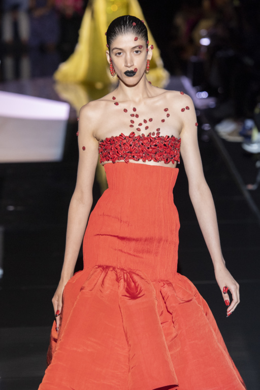 Новый креативный директор Schiaparelli Дэниел Розберри, назначенный на эту должность в апреле, стал одним из героев показа. В начале шоу он занял место за рабочим столом в центре подиума, а модели обходили его в платьях с объемными драпировками и корсетах, расшитых вручную. Самым запоминающимся образом шоу стало красное платье с лифом, расшитым божьими коровками, которые «перебегали» от груди модели к ее лицу.