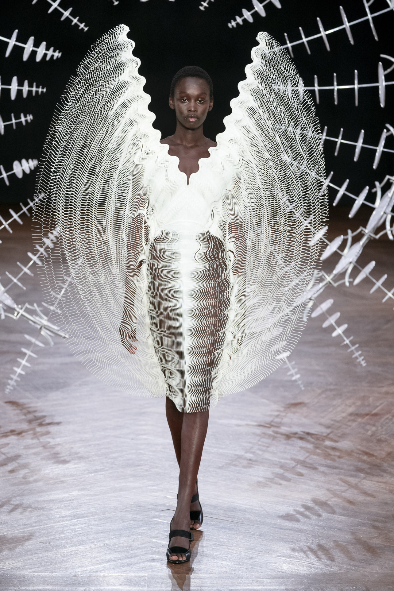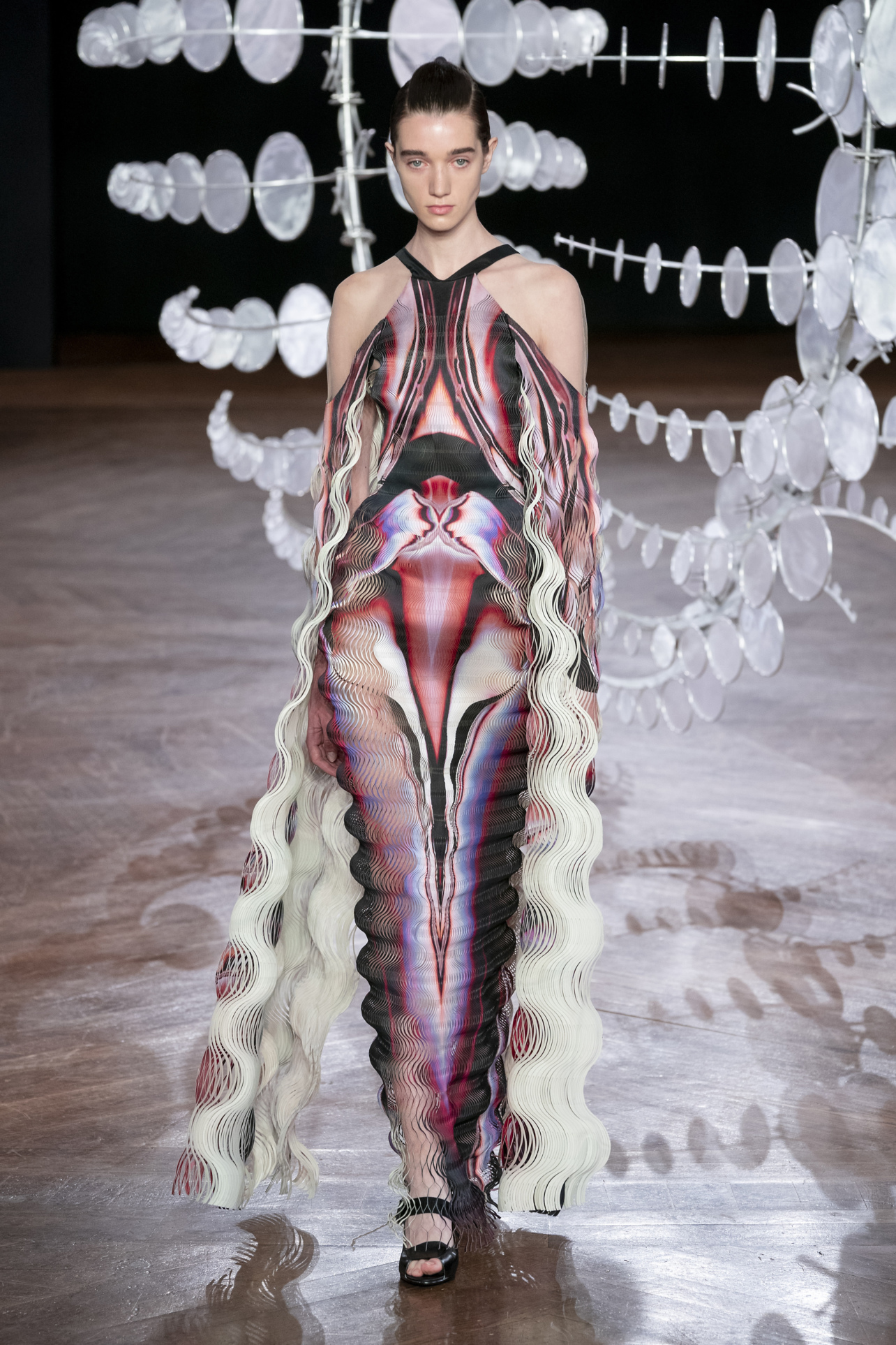 Голландский модельер Ирис ван Херпен практически превратила показ в выставку американского кинетического скульптора Энтони Хоу. Для шоу художник создал масштабную динамичную конструкцию, через которую проходили модели. Они демонстрировали платья с подвижными декоративными элементами, напечатанными на 3D-принтере.