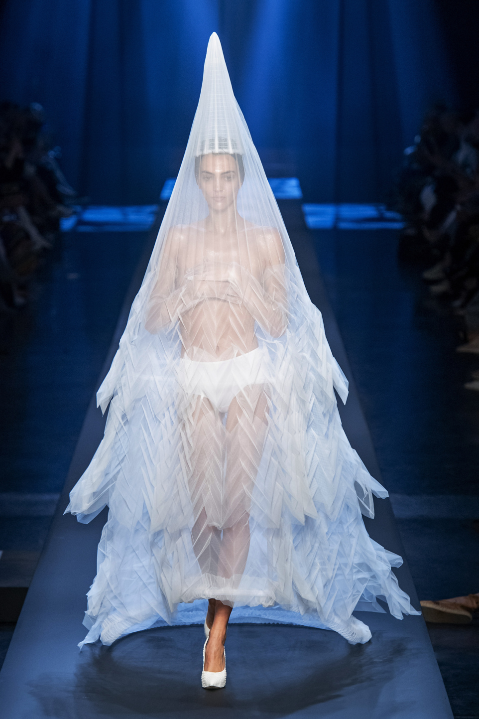 Жан-Поль Готье устроил из показа шоу иллюзиониста. Для кутюрной коллекции он использовал ткани с принтом, которые имитировали настоящий мех и шкуры животных. А главным фокусом стало конусообразное белое платье-колпак, напоминающее сами понимаете какие костюмы, за которое дизайнеру не отвесили обвинений в расизме (по крайней мере пока).