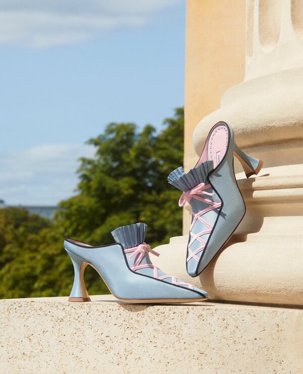 Это мы полюбили Марию Антуанетту после одноименного фильма Софии Копполы, а Маноло Бланик избрал ее своей иконой стиля еще в 1940-х годах: мать зачитывала ему биографию казненной французской королевы перед сном в качестве сказки (интересно, с оригинальной ли концовкой). Словом, неудивительно, что именно Бланик выступил партнером выставки Marie Antoinette: The Origins of a Style в Музее Виктории и Альберта и выпустил под это дело целую коллекцию. Нежно-голубые мюли с розовыми бантиками, пудровые лодочки с рюшами вместо язычка и оливковые мюли с шелковыми розетками — икона рококо одобрила бы однозначно.