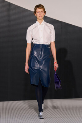 Вообще, придя в Bally, Симон принялся, как и положено дебютанту, откатываться к корням бренда — проросшим из Швейцарии. Ту же стратегию он выбрал и в Jil Sander: судя по тому, что тизер дебютного шоу снял на родине Джил Зандер в Германии, а локацией самого показа (впервые за восемь лет) выбрал штаб-квартиру ее бренда в Италии — расположенную на пьяцца Кастелло, одной из главных площадей Милана. Там, в минималистичном — полностью белом — пространстве с окнами, выходящими на замок Сфорца, шоу открыла модель и по совместительству одна из главных героинь кампейнов Jil Sander девяностых и нулевых Женевье Ван Синус. Да и сами вещи были призваны напомнить нам, чем славился бренд в те времена — а именно чистотой. Прежде всего силуэта и цвета: в Jil Sander весна-лето 2026 вы не увидите, пожалуй, ни сложных оттенков (только красный, синий и фиолетовый разных яркостей), ни сложносочиненных вещей. В основном это простые, но аккуратно скроенные — мы бы даже сказали «ладненькие» — хлопковые рубашки с коротким рукавом, прямые кожаные юбки, шерстяные брюки со стрелками и облегающие трикотажные джемперы. А еще, например, платья, вырезом отсылающие к платьям Рафа Симонса, трудившегося в марке с 2005-го по 2012-й.