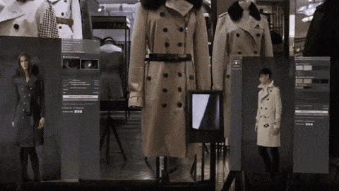 В сентябре 2012 года Burberry открыли новый флагманский магазин на Реджент-стрит, который продемонстрировал абсолютно новый подход к обустройству пространства. Кристофер Бейли, креативный директор марки и адепт современных технологий, решил буквально перенести официальный сайт в офлайн. По всему магазину было установлено 100 экранов, причем один из них — самый большой из всех, когда-либо размещенных на торговых площадках (38 кв. м), а также 500 динамиков. Среди прочего — имитация погодных условий, которые готовы выдержать тренчи Burberry, с ливнем и раскатами грома, а также интерактивные зеркала, которые, как только вы надеваете вещь, показывают ее же на подиуме, а также отсутствие касс и возможность платить через электронные девайсы.