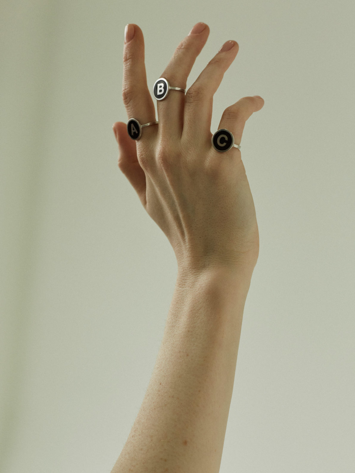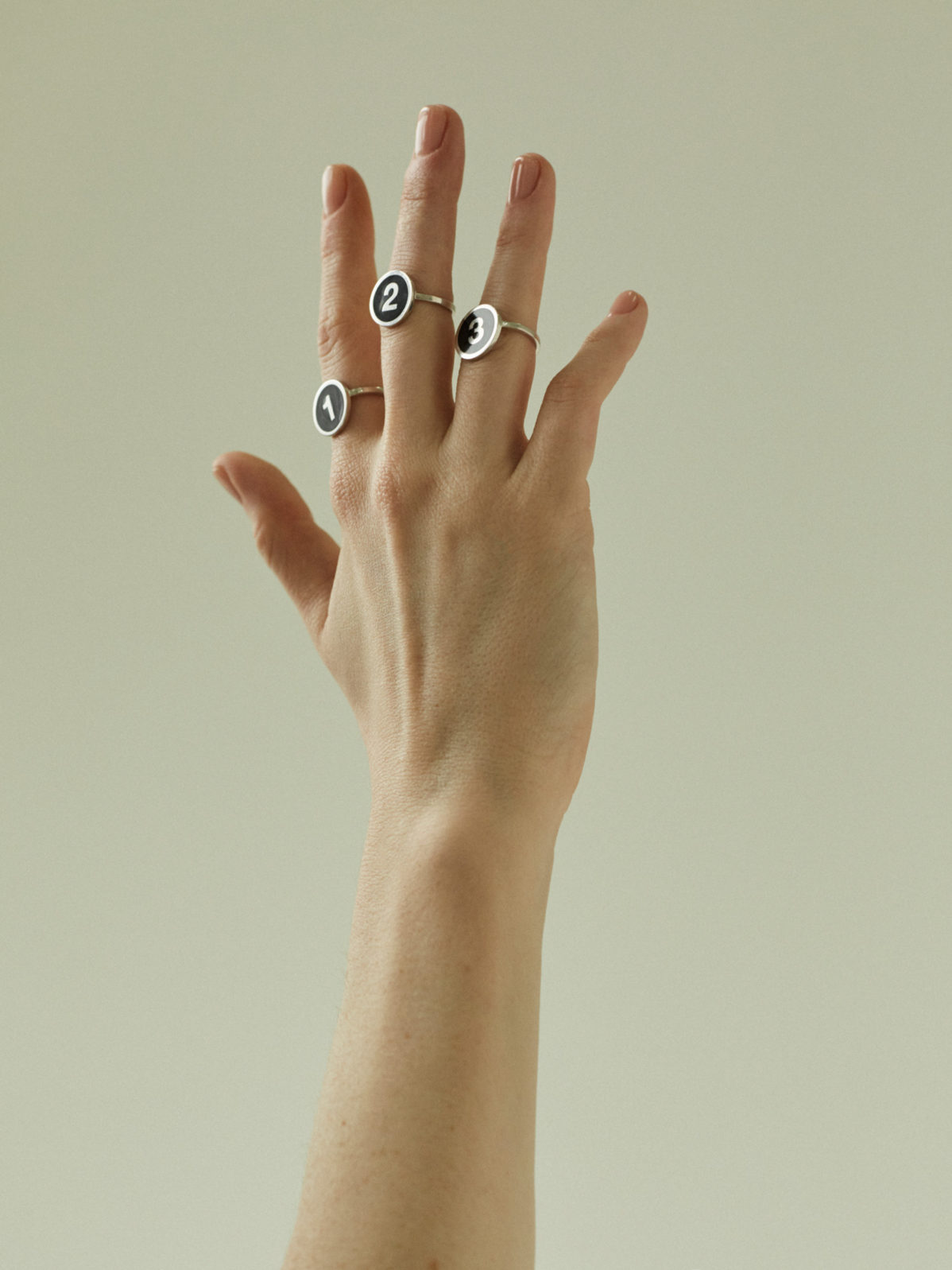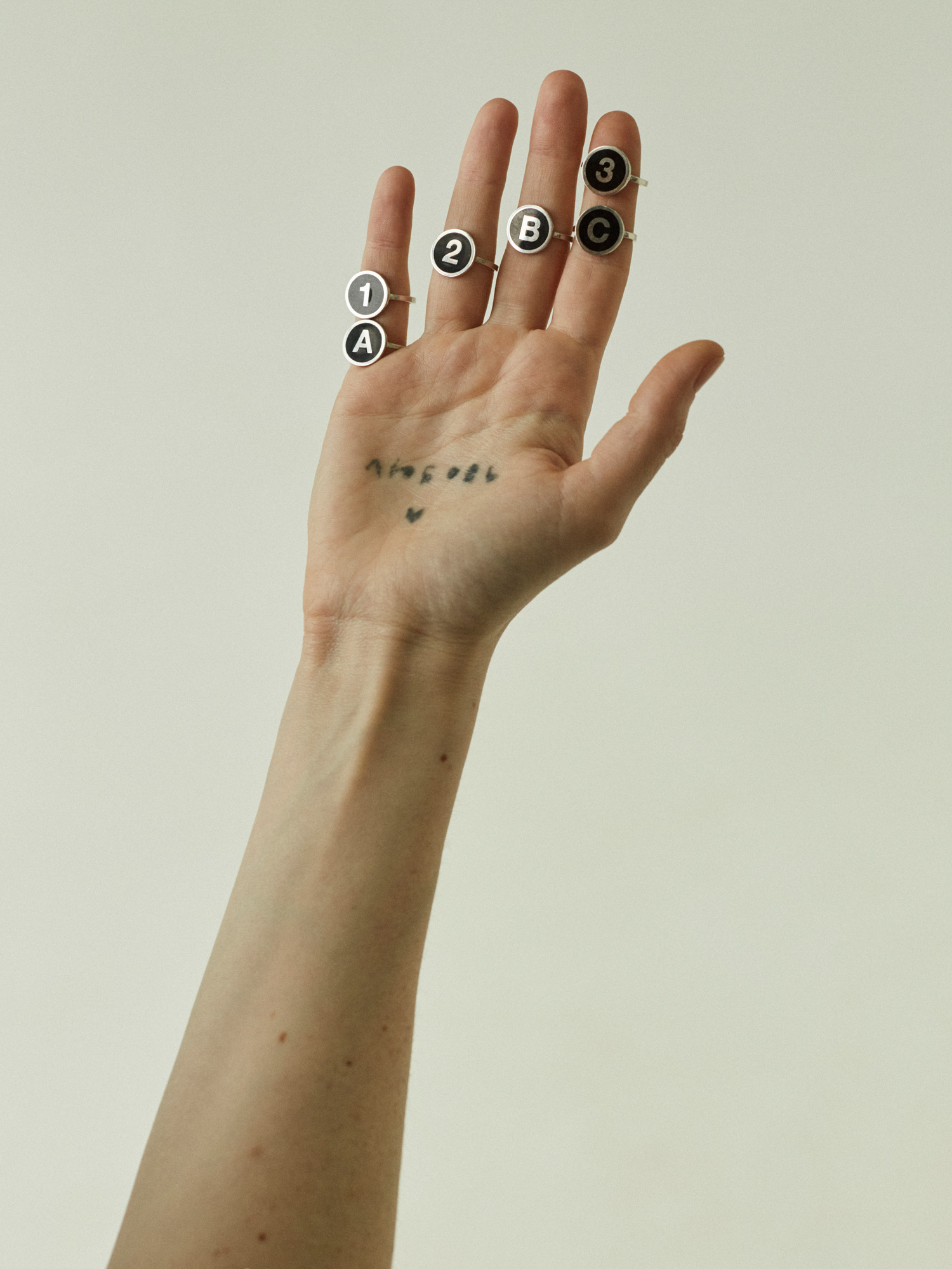 «Протей настоял, чтобы основные предметы были изготовлены в желтом золоте. Я очень редко с ним работаю. И оказалось, что это самый космический металл», — признается Наташа. «С материалом было сразу понятно, — вспоминает Протей, — золото очень сложный и небесцветный в культурном поле материал. В нем есть другая искра, если его прикладывать к моим небрежно выполненным рисункам. Вторую половину коллекции составили печатки и кольца. Сделанные из серебра и в целом более нейтральные по своей сути. Эти кольца — продолжение бесконечной мантры «1–2–3–А-Бэ-Цэ», которая идет через много работ в моем текущем цикле».