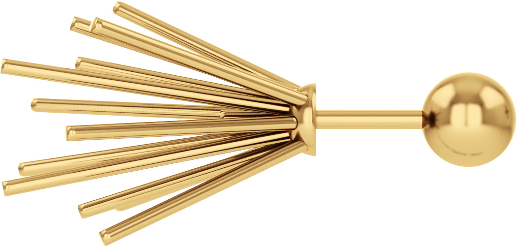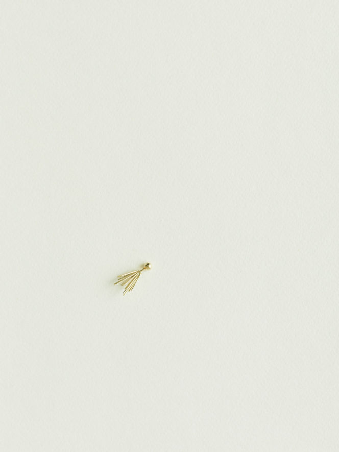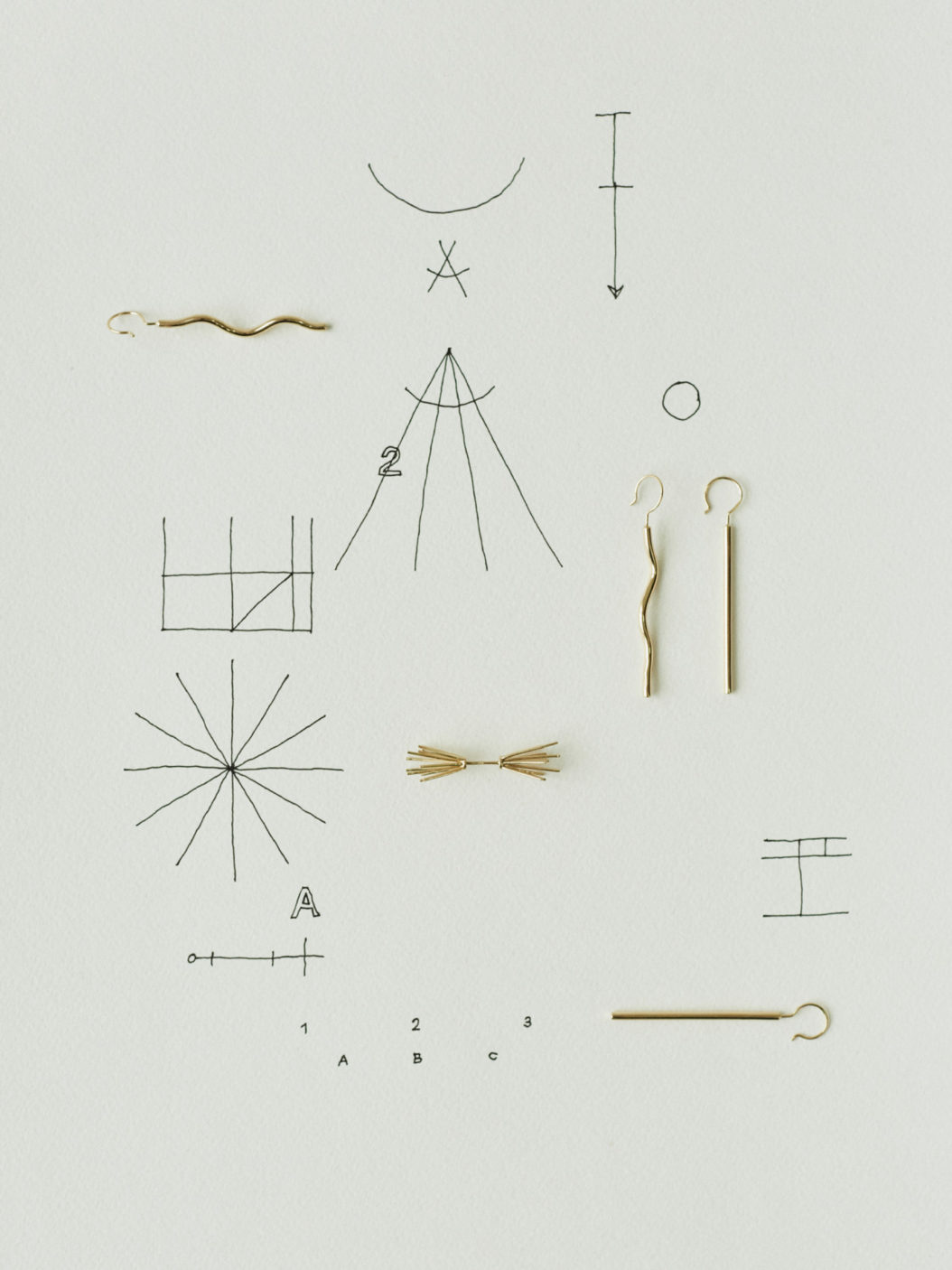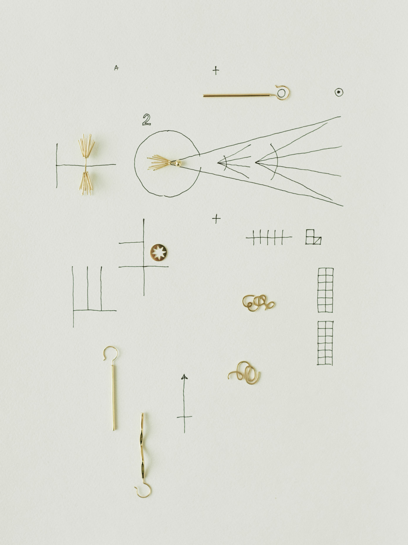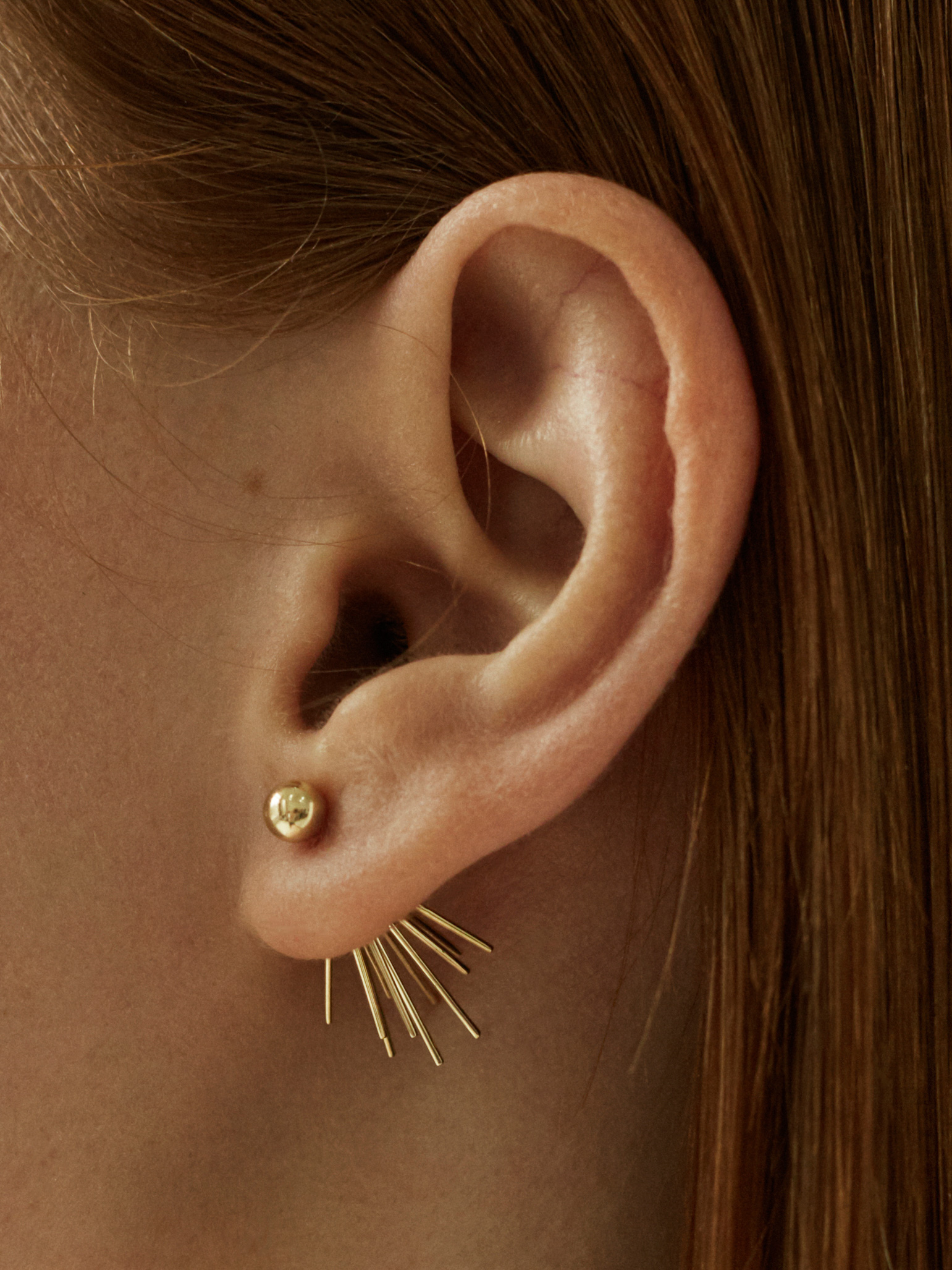 «Я изучила графику Протея, какие-то отдельные изделия мы сразу согласовали — печатку с оттиском Протея, кольца «1–2-3» и A-B-C, — рассказывает Наташа. — Мне очень хотелось сделать спутник или комету, а Протей предложил проткнуть ими ухо. Так появилось заглавное украшение — моносерьга «Комета», ради которой и стоило все это затеять. Мы пошли дальше, и комета превратилась во «Вспышку» — это как пучок лучей, которые проходят через дырочку в мочке».