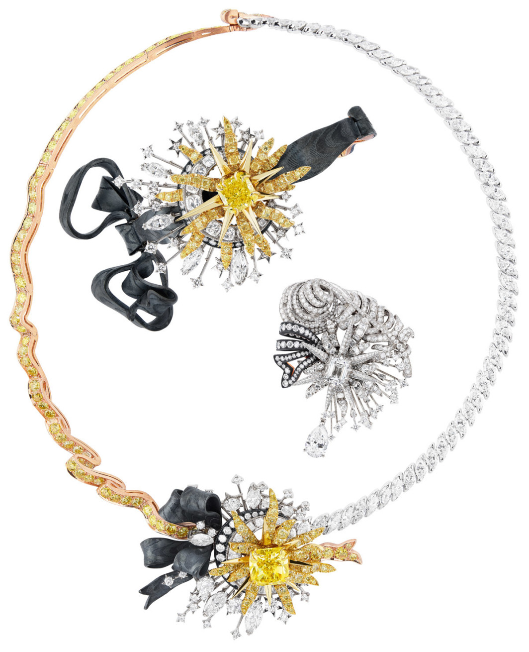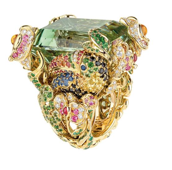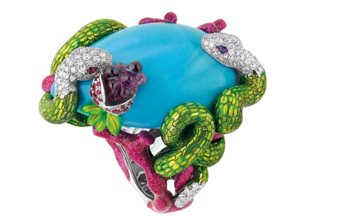 На первый взгляд кажется, что эта история затрагивает лишь тот пласт, который касается украшений на каждый день, fine jewellery в официальной ювелирной классификации. Тогда как небожители высокого ювелирного искусства остаются в своей башне из слоновой кости, где единственной надежной ценностью остается количество каратов и прочие технические характеристики, а добавленная стоимость концептуальности не играет большой роли. Это было бы так, если бы аудитория больших ювелирных домов и тех, кто рассматривает украшение с коллекционной и инвестиционной точки зрения, не начала стремительно молодеть. И диктовать свои условия. Так что, с одной стороны, караты никуда не деваются, на них по-прежнему держится значительная часть репутации крупных брендов. Более того, последние несколько лет мы из первых рядов наблюдаем это соревнование в размерах, весе, чистоте и прозрачности между бриллиантами «Садов Калахари» Chopard общим весом 342 карата, 180-каратным сапфиром из подвески Il Magni Bvlgari Fest, изумрудами на 244 карата из трансформера Drape Majéstueux Van Cleef & Arpels и далее везде.