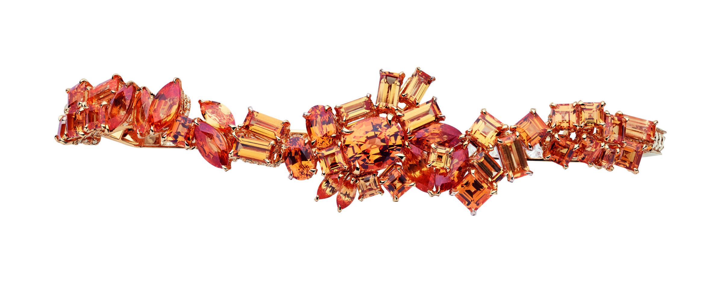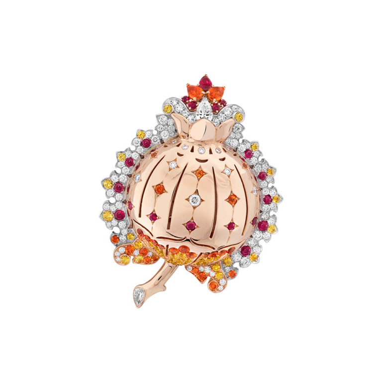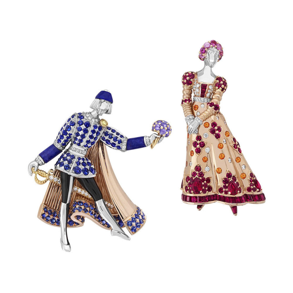 Предсказуемо много брошей. Заглавная коллекционная — «Ромео и Джульетта», это две объемные реалистичные фигурки из белого, розового и желтого золота с цветными сапфирами, гранатами-спессаритами, лазуритом и белыми и желтыми бриллиантами. У Джульетты, как и у всех женских фигурок Van Cleef & Arpels, вместо личика бриллиант огранки «роза». В 50-х годах прошлого века у Van Cleef & Arpels уже были Ромео и Джульетта. Тогда их продали в разные коллекции, и только недавно они смогли опять соединиться в частном музейном собрании дома, поэтому новых персонажей, существующих в единственном экземпляре, было решено не разлучать.