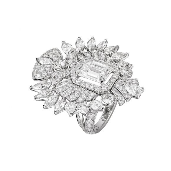У Boucheron — парижская тема. Креативный директор Клер Шуан решила взглянуть на Париж из окна исторического магазина на углу Вандомской площади. Так в новой коллекции высокого ювелирного искусства Paris, vu du 26 родилась целая серия украшений, цитирующих местные пейзажи. Струящиеся нити жемчуга в пышном сотуаре имитируют Вандомскую колонну; вандомскую брусчатку — сложенные мозаикой горные кристаллы и бриллианты в облегающем колье с подвеской-бриллиантом, которая при желании становится кольцом; акантовый орнамент, столь частый в парижской архитектуре, оплетает самое дорогое кольцо в коллекции с бриллиантом 10,56 карата (1,5 млн евро, примеряла русская клиентка), а на саму площадь дизайнер смотрела словно в калейдоскоп. Ровный прямоугольник из оникса и кахолонга множится и отражается в горном хрустале (в центре этой ювелирной «площади» и в кольце, и в сотуаре — бриллиант круглой огранки).