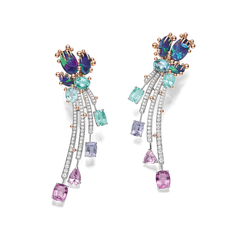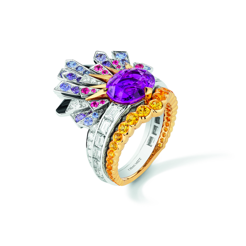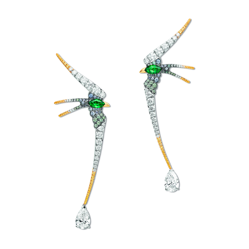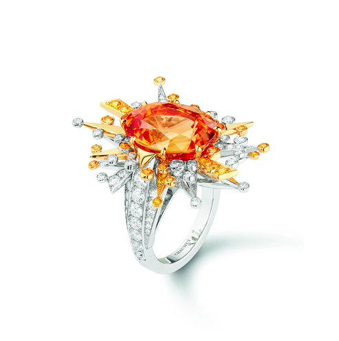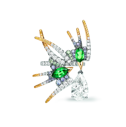 Новая коллекция haute joaillerie Chaumet — это путешествие в поэтический мир небесных грез и прекрасных иллюзий в четырех картинах («Небесные капризы», «Цвет неба», «Зарницы», «Небесные обитатели»). И картины здесь не фигура речи, а руководство к действию. В брошах, колье, кольцах, серьгах, тиарах и часах (всего 91 произведение высокого ювелирного искусства, разброс цен от 120 тыс. за броши до 1,5 млн за колье) оживают птицы с японских гравюр и полотен Пикассо и Матисса, встает золотое солнце Ван Гога, пылают закаты Синьяка, льется свет Куинджи, здесь есть место и солнечному диску с египетских орнаментов, и неоновым абстракциям современных арт-инсталляций. Сквозь облака из белых бриллиантов, как лучи солнца, блестят желтые сапфиры, изумруды, мандариновые гранаты, черные опалы и другие драгоценные камни с завидной родословной.