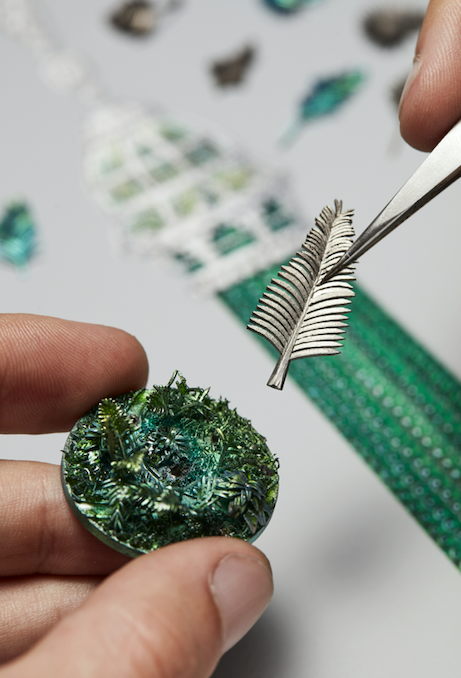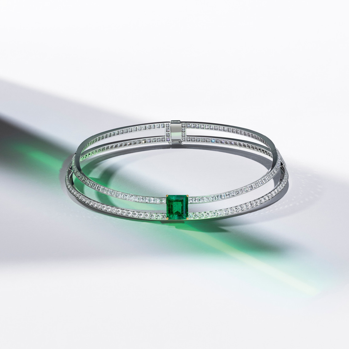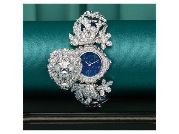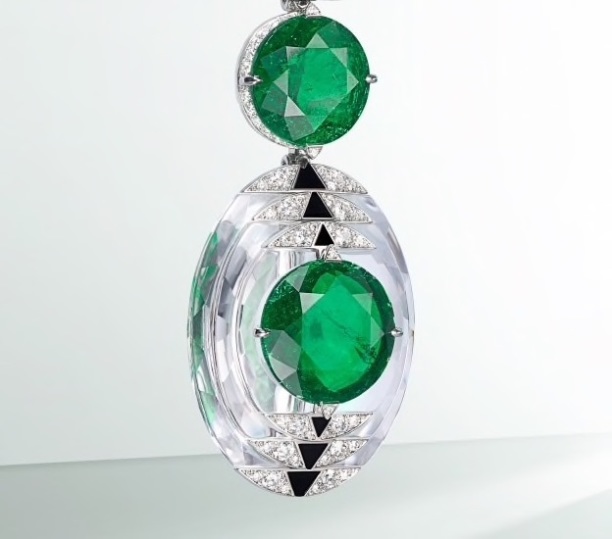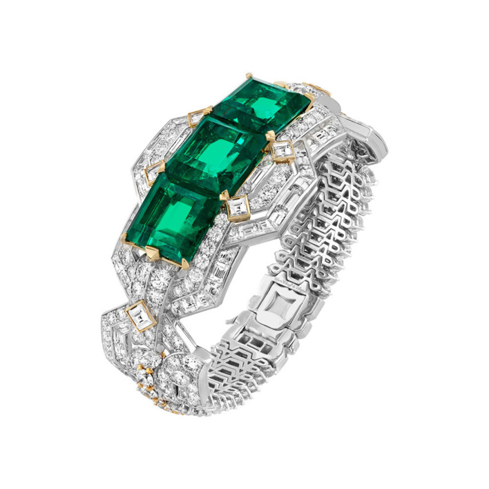 Вид сверху есть и на Grand Palais. Стеклянный купол-неф из белого золота с бриллиантами представлен как подвеска в сотуаре из изумрудов весом 900 карат (690 тыс. евро), но также может выступать отдельно в виде броши. И брошь эта — настоящая миниатюрная скульптура, потому что, вооружившись лупой, внутри можно разглядеть зимний сад с крошечными пальмами из титана. А вот лошадиные головы — застежки браслета — из молочного кварца, переехавшие на запястье с крыши Opera Garnier, видно невооруженным глазом.