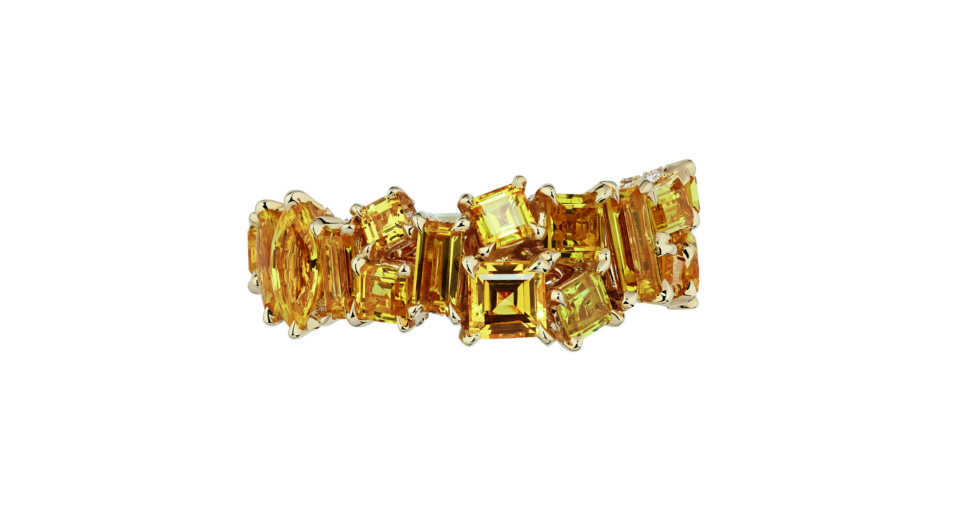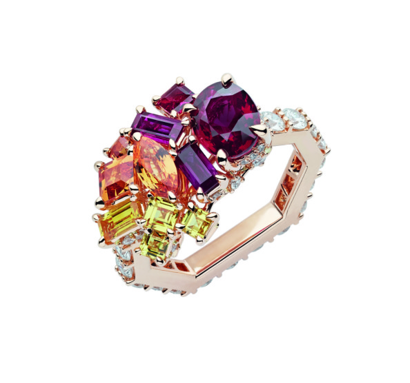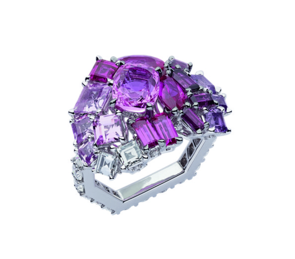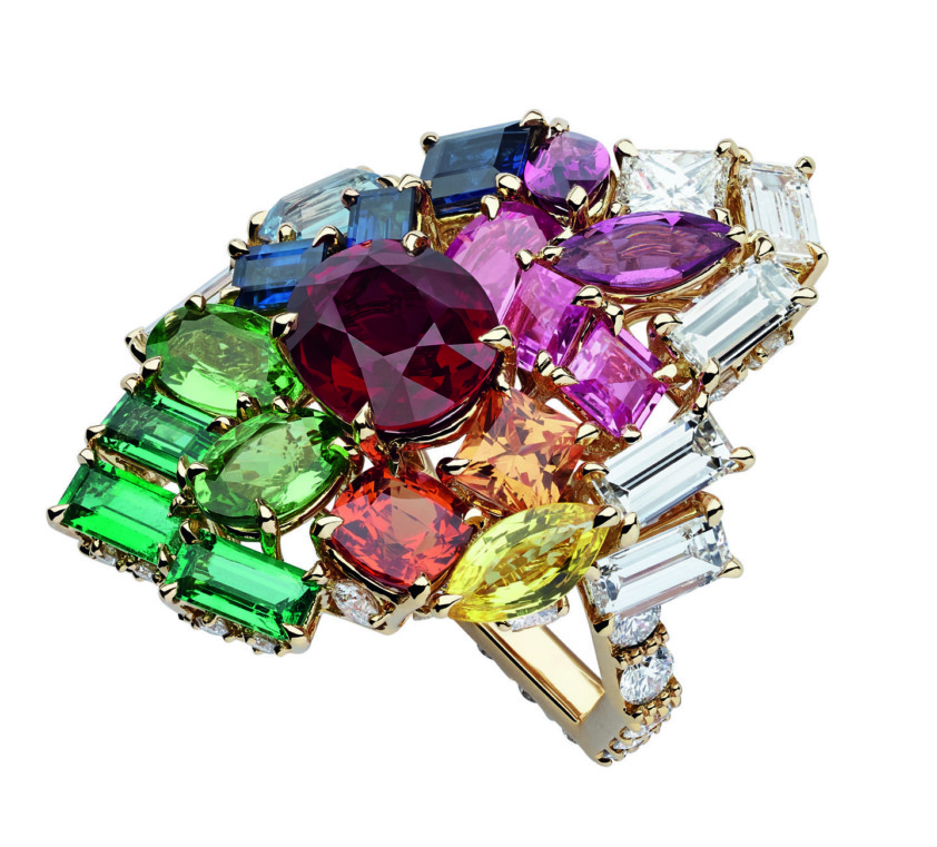 Gem Dior — самая большая коллекция Виктуар де Кастеллан за все эти годы: 99 произведений высокого ювелирного искусства. Часть из них для самых избранных была представлена сначала в Венеции, а затем состоялась и официальная премьера в Париже, где при ценах от 120 тыс. до 2 млн. евро от золотых и серебряных звезд (верный знак того, что вещь продана или зарезервирована) не было отбоя. В коллекции, которая чествует драгоценные камни, три большие главы. Монохром — украшения с камнями одного цвета. Деграде — плавный переход от одного цвета к другому, более нейтральному, чаще всего белому. И полихром — взрывная смесь из рубинов, изумрудов, цаворитов, розовых, желтых, пурпурных сапфиров, шпинелей, поданных в самых неожиданных конфигурациях. Выбор металла, в который заключен камень, влияет на восприятие его цвета, говорит де Кастеллан и тут же приводит наглядный пример. Так, сапфиры в дуэте с розовым золотом дают «деним», а в дуэте с желтым — ультрамарин.