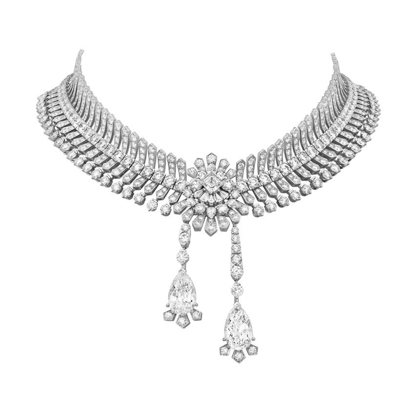 У коллекции две главные темы — империя и фольклор. Первая представлена коронами и двуглавыми орлами разной степени узнаваемости и реализма. Они выступают как в составе колье или серег, так и сольно — в партии броши или неброских «гвоздиков». Вторая тема отсылает к народным ремеслам, древнерусским орнаментам, узорам и вышивке в исполнении белых и желтых драгоценных металлов и камней с вкраплением жемчуга — тоже очень русское сочетание. Здесь оживают книжные иллюстрации Билибина и Васнецова, колосится рожь (два потрясающих сета «Пшеница Габриэль» и «Пшеница Мари»), а Анна Павлова готовится танцевать «русскую» в sarafane и kokochnike. Отрадно, что Chanel вновь вернулись к украшениям для головы. Есть тончайшая тиара с переплетенными, как кружево, розовыми шпинелями, гранатами и цветными турмалинами, а есть колье из белого золота, жемчуга и бриллиантов: сажается на ободок и вуаля — готовый кокошник.