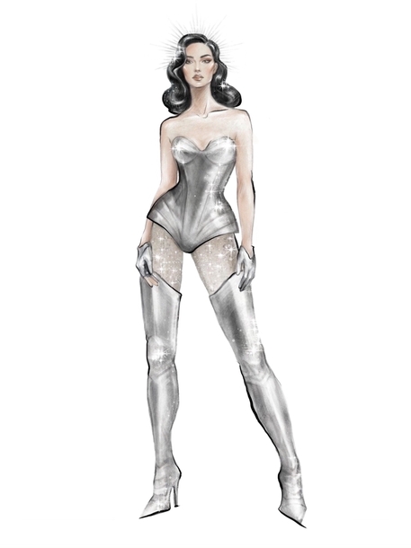 На шоу «Голд» это будут подчеркивать образы-трансформеры. Первый блок, с песнями Serebro (или, как говорит Ольга, со «всем нашим родным и любимым, с чем мы росли, были свободными и счастливыми»), ознаменуется серебряным корсетом, напоминающим доспехи. «Мы вдохновились архивными показами Mugler, — рассказывает Алевтина. — Как и все образы для Ольги, корсет создал портной Иван Летуновский — я в него влюблена, потому что он невероятно сажает вещи на женщин. Не знаю, как он это делает — но он буквально превращает их в скульптуры». Иван, который раньше шил образы для Кети Топурии и Нюши, а сейчас сотрудничает с солисткой Artik & Asti Севиль Велиевой, рассказывает, что «доспехи» сшиты из ткани, но за счет металлического блеска действительно напоминают броню. На концерте ее дополнят блестящие легинсы Giuseppe di Morabito и длинная, конечно, рыцарская, серебряная накидка — под конец ее сменит металлизированная куртка Balenciaga. Особенно эффектно, подчеркивает Ольга, эти серебряные образы будут смотреться под лунным светом, который будет заливать сцену в этом блоке.