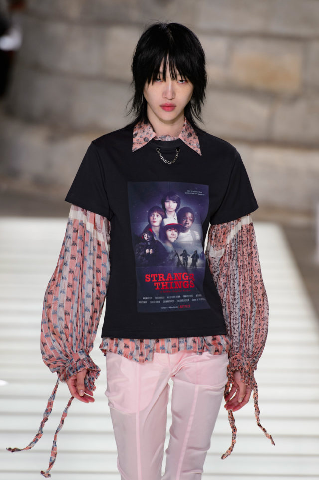 Вчера завершилась парижская неделя моды. Марафон показов закрыло шоу Louis Vuitton. Помимо расшитых камзолов в весенне-летнюю коллекцию вошел мерчендайз Stranger Things — футболка с афишей сериала, второй сезон которого выйдет совсем скоро, в конце октября. В прошлом году Stranger Things наделал много шума: тогда еще двенадцатилетняя Милли Бобби Браун и тринадцатилетний Финн Вулфхард, исполнители главных ролей, снялись для обложки Dazed, а Браун стала лицом рекламной кампании Calvin Klein. Креативному директору Louis Vuitton Николя Гескьеру сериал, очевидно, тоже понравился. Но своей любви к sci-fi он никогда не скрывал. Даже наоборот. Он не стеснялся выкладывать в Instagram фотографию своего игрушечного штурмовика, а будучи на посту креативного директора Balenciaga, добрую половину коллекции мог украсить принтами, напоминающими афиши научно-фантастических фильмов, а в съемке для американского Harper’s Bazaar сражался на световых мечах с Шарлоттой Генсбур. В Louis Vuitton дизайнер тоже не раз обращался к теме sci-fi, особенно в последних коллекциях.