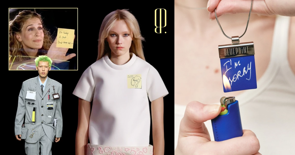 Новая коллаборация The Blueprint — с брендом Imakebags. Вместе с его основательницей Ксенией Лапшовой мы переосмыслили один из самых популярных аксессуаров марки — подвеску-стикер, цитирующую записку, которую оставил Кэрри Брэдшоу убегающий Джек Бергер: «I’m sorry. I can’t. Don’t hate me». На новой, синей версии кожаного стикера вы можете оставить собственное послание — с помощью специально белой пасты, идущей в комплекте и стирающейся при легком нагревании. Самое злободневное послание можно подглядеть в весенне-летней коллекции Марка Джейкобса, где одну из белых футболок украшает стикер «Too many thinkings». А самый вечный вариант — на показе Moschino Resort 2025, где Адриан Аппиолаза оставил стикеры на пиджаках пустыми, напомнив, что тишина бывает красноречивее любых слов. Вспомнили и другие появления стикеров на подиумах, глянцевых обложках, а также в любимых фильмах и сериалах — повод пересмотреть, припомнить старые добрые истины и обзавестись новыми мыслями, чтобы записать и потом гордо носить на груди.