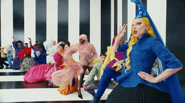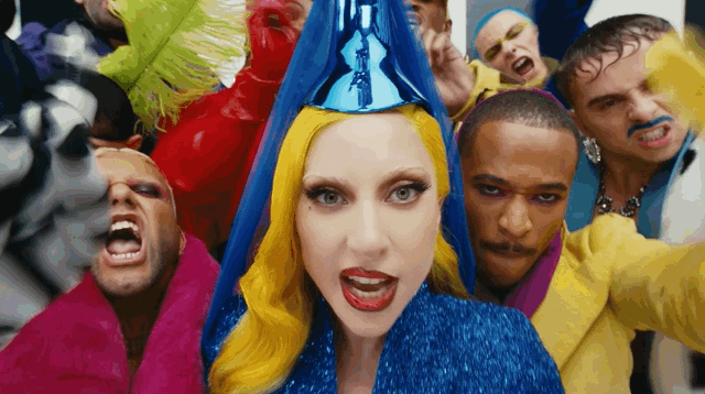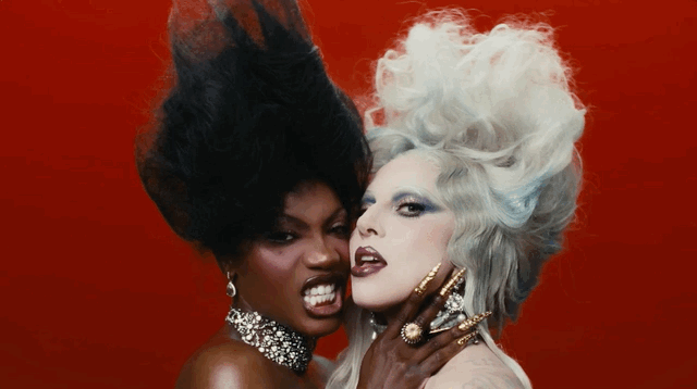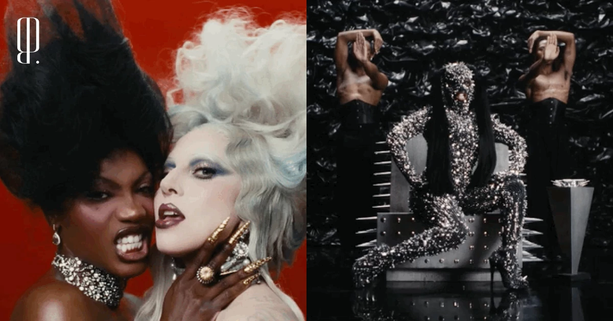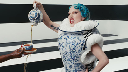 «Здоровое сочетание молодых и старых брендов», — характеризует американский Vogue стиль уже самих Гаги и Доучи: хотя из «старых» невооруженным глазом можно заметить разве что Viktor & Rolf. Гагу на съемках клипа наряжали сестры-стилистки Хлоя и Шенель Дельгадилло, которые прежде всего трудятся над гардеробами Розалии и Оливии Родриго. Для певицы они выбрали несколько кэмповских образов: например, синее платье с плиссированным низом и расшитым стеклярусом верхом из кутюрной коллекции Robert Wun весна-лето 2026 они дополнили — нехитро, ровно как на показе Вуна, — таким же синим колпаком в форме руки, как бы держащей длинную вуаль. Или одолжили топ, похожий на белую керамическую вазу с синим цветочным узором, у лондонского дизайнера, художника и основателя бренда Thevxlley Даниэля дель Валле, который буквально недавно стал финалистом LVMH Prize 2026. А еще добыли платье-колонну Bad Binch TongTong — с «ореолом» из перьев. Справились — судя по тому, что Vogue констатировал безупречность стиля «матери монстров», — на отлично. Да и фанатов Гаги порадовали: в каждом образе они нашли отсылки к ее старым музыкальным клипам и журнальным съемкам: так, укладка из желтых локонов — кивок в сторону Telephone, а маска из сверкающих кристаллов — напоминание о Bad Romance.