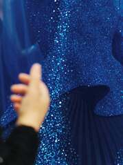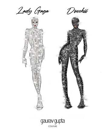 Тем временем стилист Доучи Сэм Вулф (среди его подопечных еще Дженни из Blackpink) от курса на кэмп тоже не отставал: в первую очередь обратился к Харрису Риду за нарядом из его деми-кутюрной коллекции весна-лето 2026 — а точнее, за платьем, состоящим лишь из каркаса, завернутого в кусочек цветочной тафты на бедрах. Кроме того, Вулф позаимствовал у Виктора Хорстинга и Рольфа Снорена боди с оборками, напоминающими кремовые волны на тортах, — из кутюрной коллекции осень-зима 2023/2024. Впрочем, не менее эффектно смотрятся парные образы певиц — прежде всего пышные бальные платья из шелка и тафты в духе Марии-Антуанетты, созданные американским дизайнером Клэр Салливан и ее молодой именной маркой Miss Claire Sullivan. Или обтягивающие кэтсьюты Gaurav Gupta, которые полностью, с ног до головы, вручную расшиты шипами, кристаллами и жемчужинами, — по словам Гурава Гупты, на каждый ушло более 800 часов и 3000 деталей. Хотя по-настоящему парным нарядом можно назвать только алое двубортное платье-жакет Luar — разработанное Раулем Лопесом будто для сиамских близнецов так, что в него одновременно поместились и Гага, и Доучи.