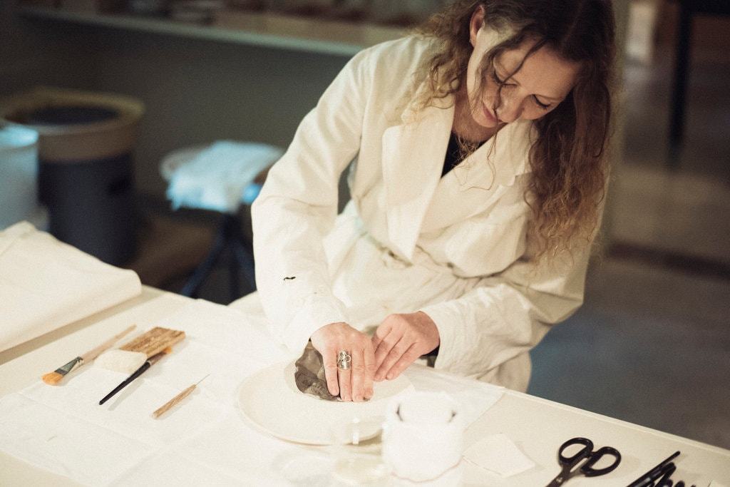 Мастерская Анн Демельмейстер находится в подвале ее дома. На фото она шлифует форфоровую тарелку