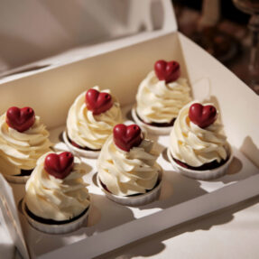 В коробочке, украшенной бархатной или атласной (на выбор) лентой, сразу несколько сладких валентинок на влажном бисквитном тесте с малиновой начинкой — все украшены шапочкой из маскарпоне и глянцевым шоколадным сердечком.