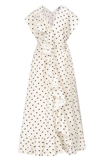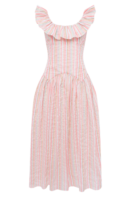 Платья на низкой талии, так популярные два последних лета, все еще актуальны. Ассоциации с флэпперами из 1920-х сохраняются (и, например, блестящее платье Simone Rocha и синее атласное JW Anderson их поддерживают), но уже менее отчетливы — например, платье в цветную полоску Kalmanovich с оборкой на воротнике в лукбуке марки, скорее, напоминает о цирке. А, скажем, у пудрово-розовых платьев Balenciaga талия уже не на уровне бедер, а на десяток сантиметров ниже.
