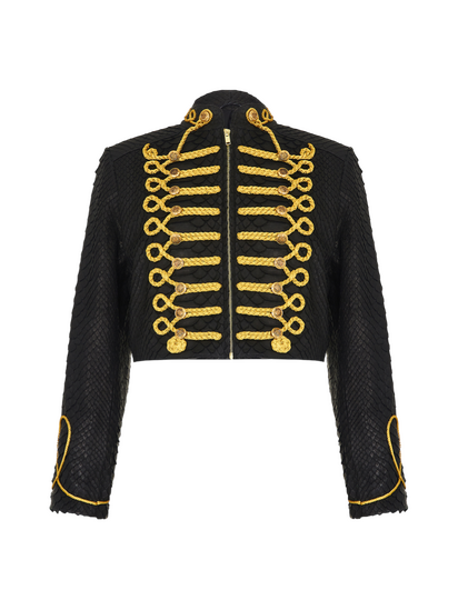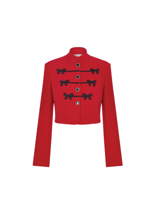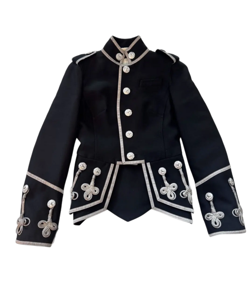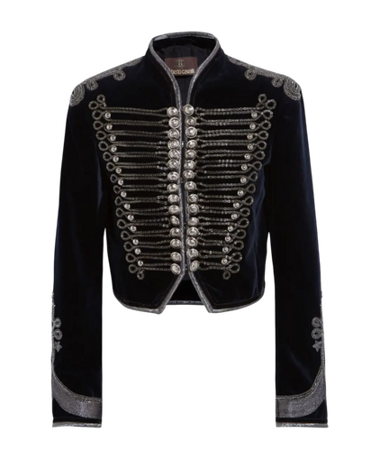 Если наткнуться на подобный жакет в тиктоке (а это трудно не сделать — он там сейчас довольно популярен), то, скорее всего, его будет сопровождать пометка «наполеоновский». И это, в общем-то, справедливо: в эпоху наполеоновских войн мундир — изначально часть униформы гусар, легкой кавалерии, возникшей в Венгрии в XV веке, — закрепился как символ военной доблести и статуса. Именно тогда оформилась его самая известная, парадная версия — с галунами и эполетами с бахромой. Тогда как в более ранние периоды его отличали прежде всего приталенный силуэт и шнуровка на груди.