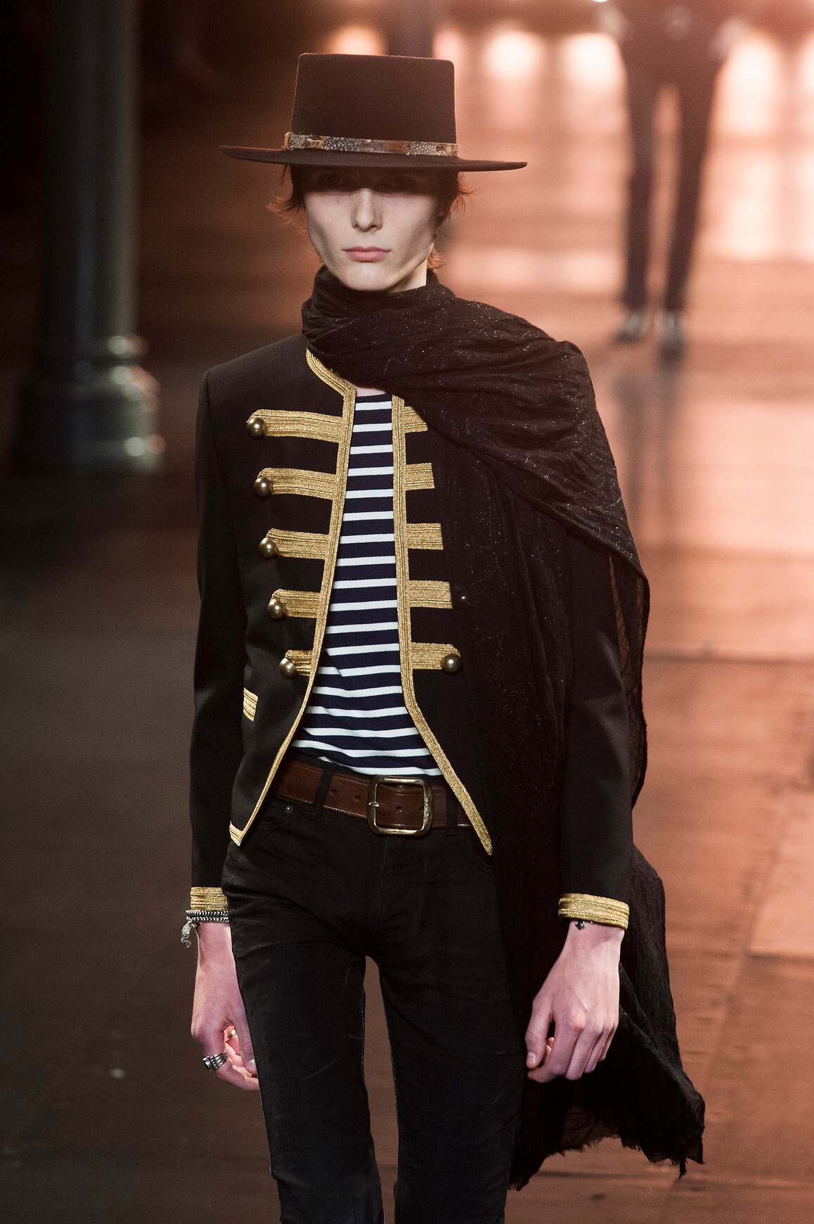 Но в современной модной истории этот жакет закрепился не столько как наполеоновский, сколько как один из самых узнаваемых силуэтов эпохи инди-слиз, она же эра Эди Слимана. Еще в статусе креативного директора Dior Homme, в нулевых, дизайнер превратил мундир в культовую модную вещь, воспевая стиль рок-музыкантов вроде Пита Доэрти. (Впрочем, самый известный образ нулевых, который вспоминают в контексте гусарских жакетов, — это выход Кейт Мосс в кремовом доломане под кожаной курткой и микрошортах на рок-фестивале Гластонбери в 2005 году.). Ту же линию Слиман продолжил и в Saint Laurent, начиная со своей дебютной мужской коллекции осень-зима 2013/2014. Значительное влияние на популярность мундиров оказывали и его коллеги — Вивьен Вествуд, Джон Гальяно, Александр Маккуин, тоже обращавшиеся в свое время к французской военной форме XIX века.