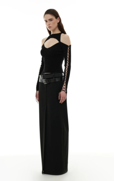 Модели с заниженной талией или корсетным поясом будто созданы для того, чтобы носить их с кроп-топами или укороченными рубашками, показывая пресс (и не только). Инфлюенсер София Коэльо сочетает такую юбку с мотокурткой, а команда российского бренда BNPRT интересно обыграла низкую посадку с помощью торчащих из-под юбки колготок.