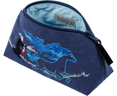 Ну а виртуально в поп-апе участвует Ola Ola, однажды попавшая к нам в рубрику «Марка с большим будущим» за славные истории, которые рассказывает на пиджаках и платьях с помощью принтов, — марка выпустила синие косметички и мягкие обложки для паспорта; они изображают девчонку, которая пытается догнать скачущую Огненную Лошадь. Аксессуары доступны на сайте бренда.