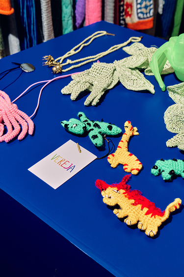 Найти их можно на первом этаже «Салариса»: ориентируйтесь на синие рифленые кресла дизайн-студии Eburet, на которых можно перевести дух, и сказочные арки-порталы, которые сделал резидент ежегодного списка новых имен креативных индустрий The Blueprint 100, бренд Vereja. На полках поп-апа вы найдете его яркие вязаные свитера, сумки и 3D-кольца (в том числе — созданные специально для пространства), на которых живет Чихпаук: гибрид чихуахуа и паука по кличке Андрей.