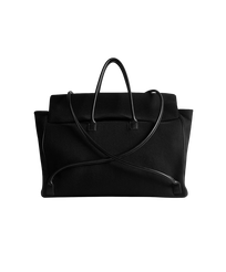 Как забыть о сумке размера XXL, когда существует фотография Рианны с до комичности огромным баулом Saint Laurent? Российский бренд Ushatava тоже не смог ее развидеть и представил свой внушительный аксессуар — шириной в полметра. Прототипом послужил саквояж, в котором мама дизайнера Нино Шаматавы хранит пряжу и инструменты для вязания.