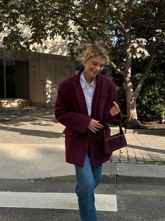 Цвет бургунди, который теперь в узких кругах широко известен как Gucci Rosso Ancora и даже под новым названием уже не только прослыл одним из главных цветов осени, но и набил оскомину. Верхнюю одежду этого оттенка можно найти у Lesyanebo, Selfmade, Les Archives и Annuko — пальто последних несмотря на еще по-летнему теплую погоду уже примерила Мария Червоткина. Надела его с полупрозрачным облегающим комбинезоном и завершила образ высокими сапогами.