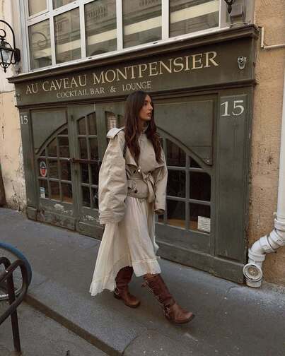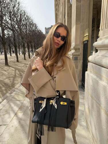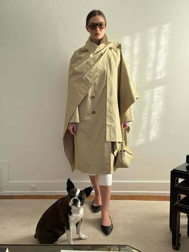 Во-вторых, на то, как выглядят самые актуальные тренчи, повлияли кейпы, пелерины и пончо, вернувшиеся в моду не так давно. И, скажем, в весенних коллекциях российских брендов можно увидеть немало гибридных тренчей: например, у Limé они с разрезами для рук, как у кейпа, а у Lesyanebo с рукавами «летучая мышь», так что плащ напоминает пончо. Один из самых модных вариантов носить очень объемный тренч — с капри, как модный
